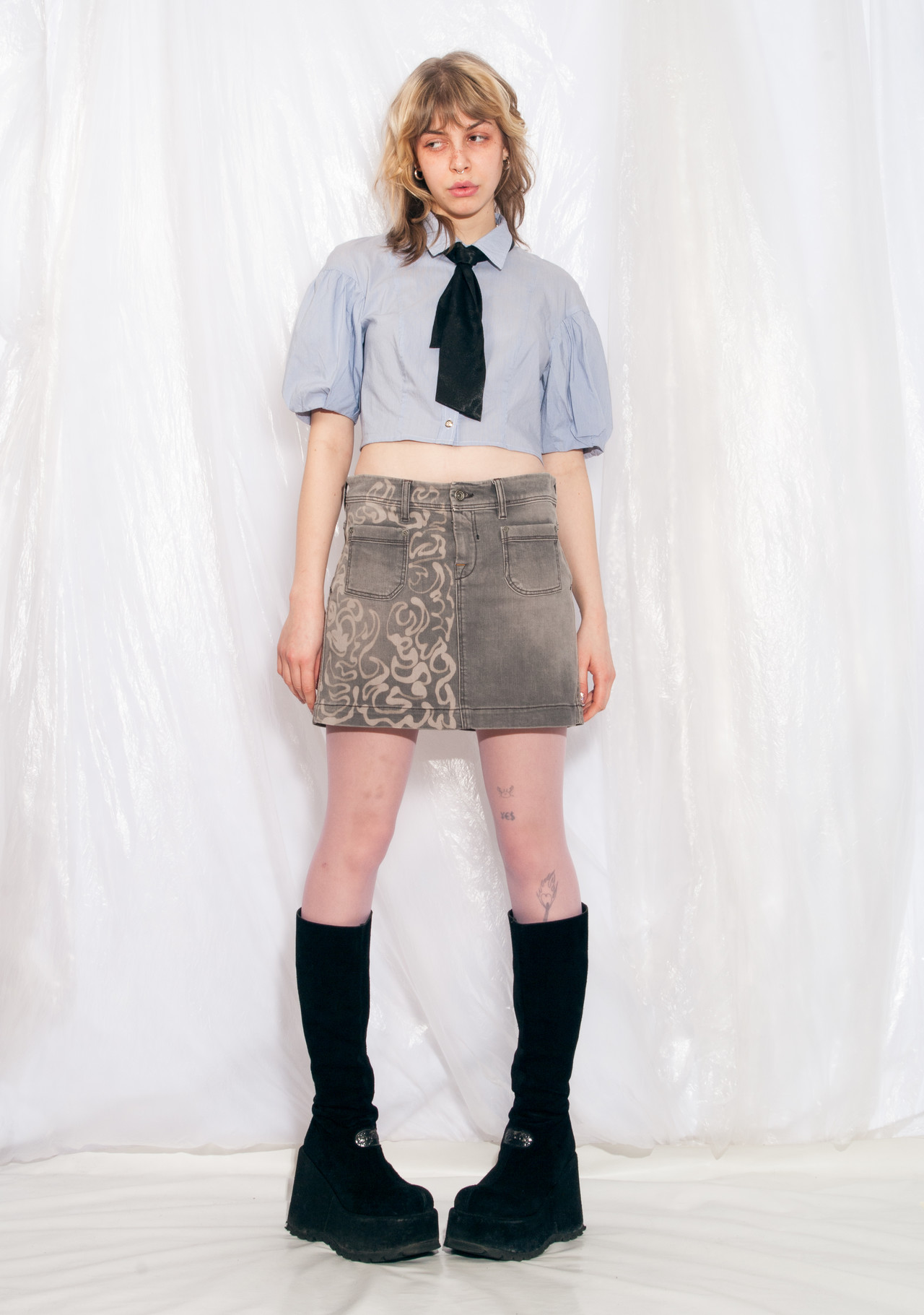 Vintage Denim Skirt Y2K Painted Flame Mini in Grey