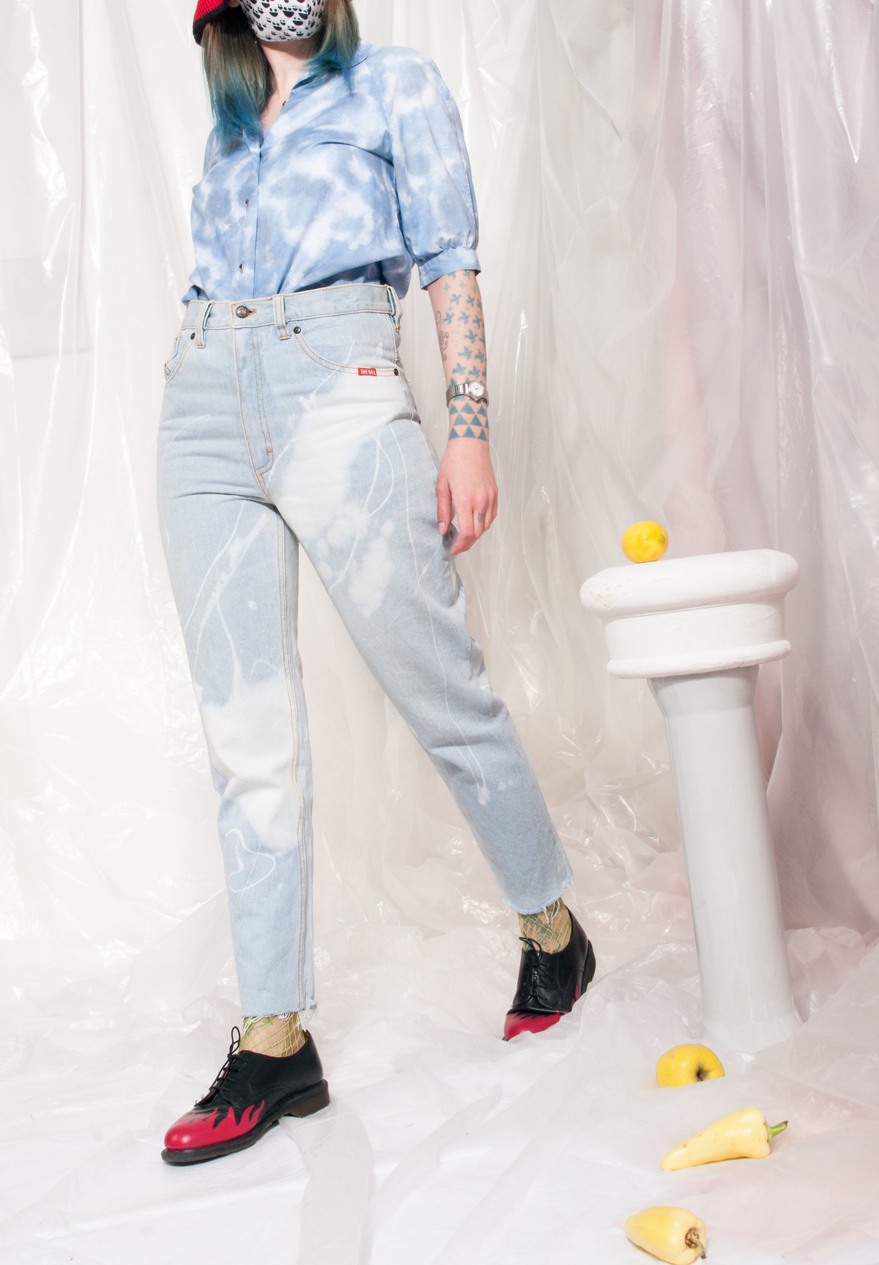 Reworked vintage Diesel jeans with shredded hems and hand-bleached pattern, a classic 80s piece reimagined. After bleaching it, we sewed on a hand-printed Pop Sick patch. Front zip and button closure, five pockets, thick denim fabric. Made in USA. Don’t hesitate, grab this one off-babe — and pair it with more sustainable fashion gems! Its waist is quite wide compared to its hip, so a belt might will be needed.