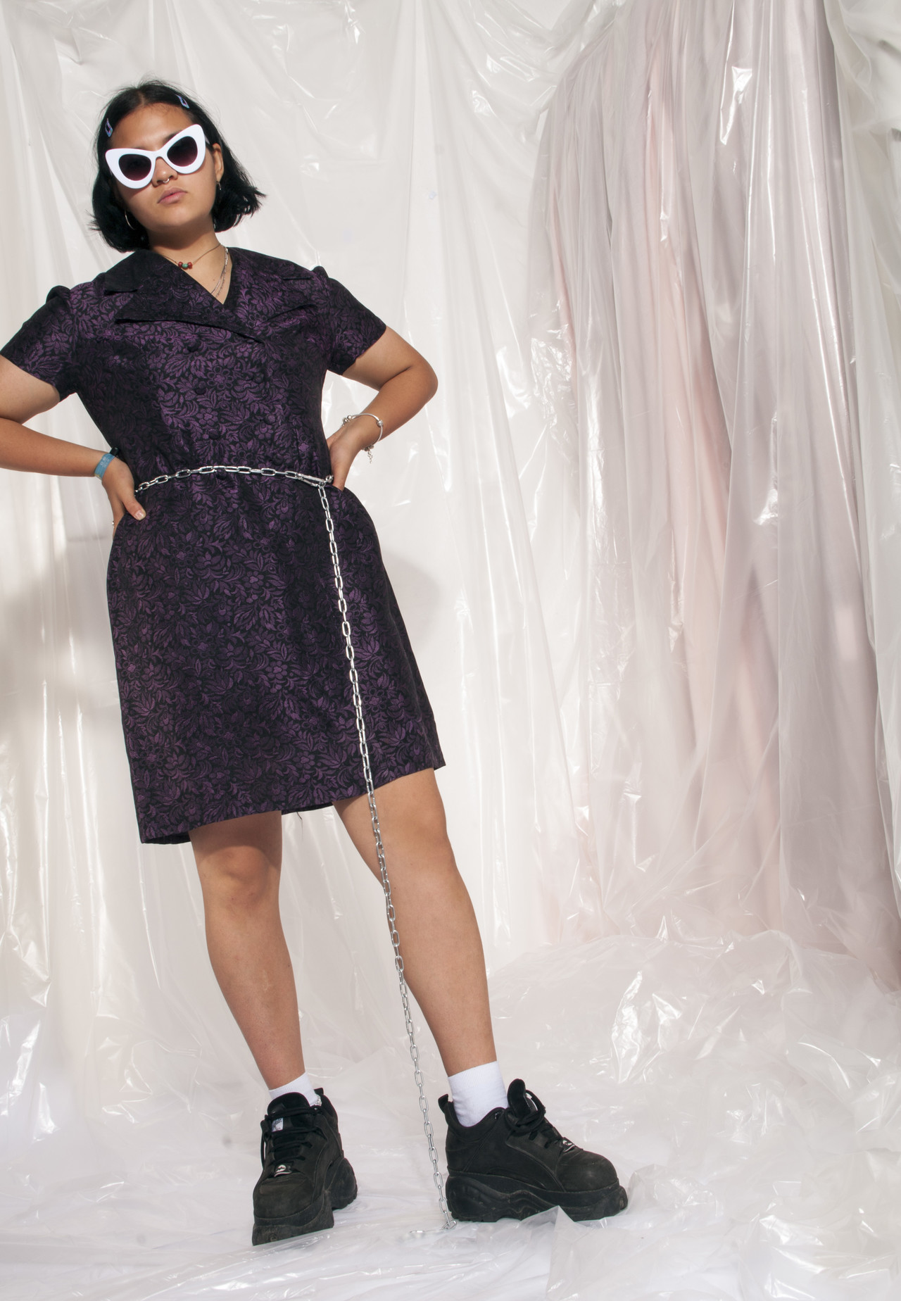 This one is an absolutely stunning purple taffeta shirt dress with a psychedelic floral pattern. It’s just got through our company time tunnel in flawless condition and that’s a real miracle since it was made back in the 60s. Has a button closure and it’s unlined. Killer with chunky boots.