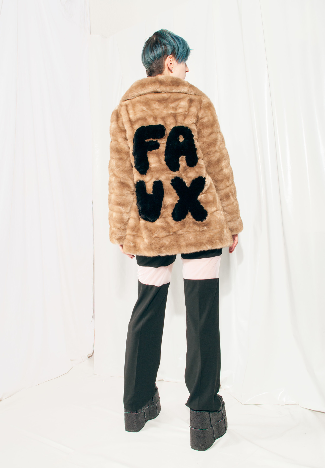 Reworked vintage faux fur coat straight from the 70s in mint condition. The big FAUX pattern on its back is hand-sewn by us. The coat is warm and it has two pockets and a hook closure. It’s fully lined. Made in England.