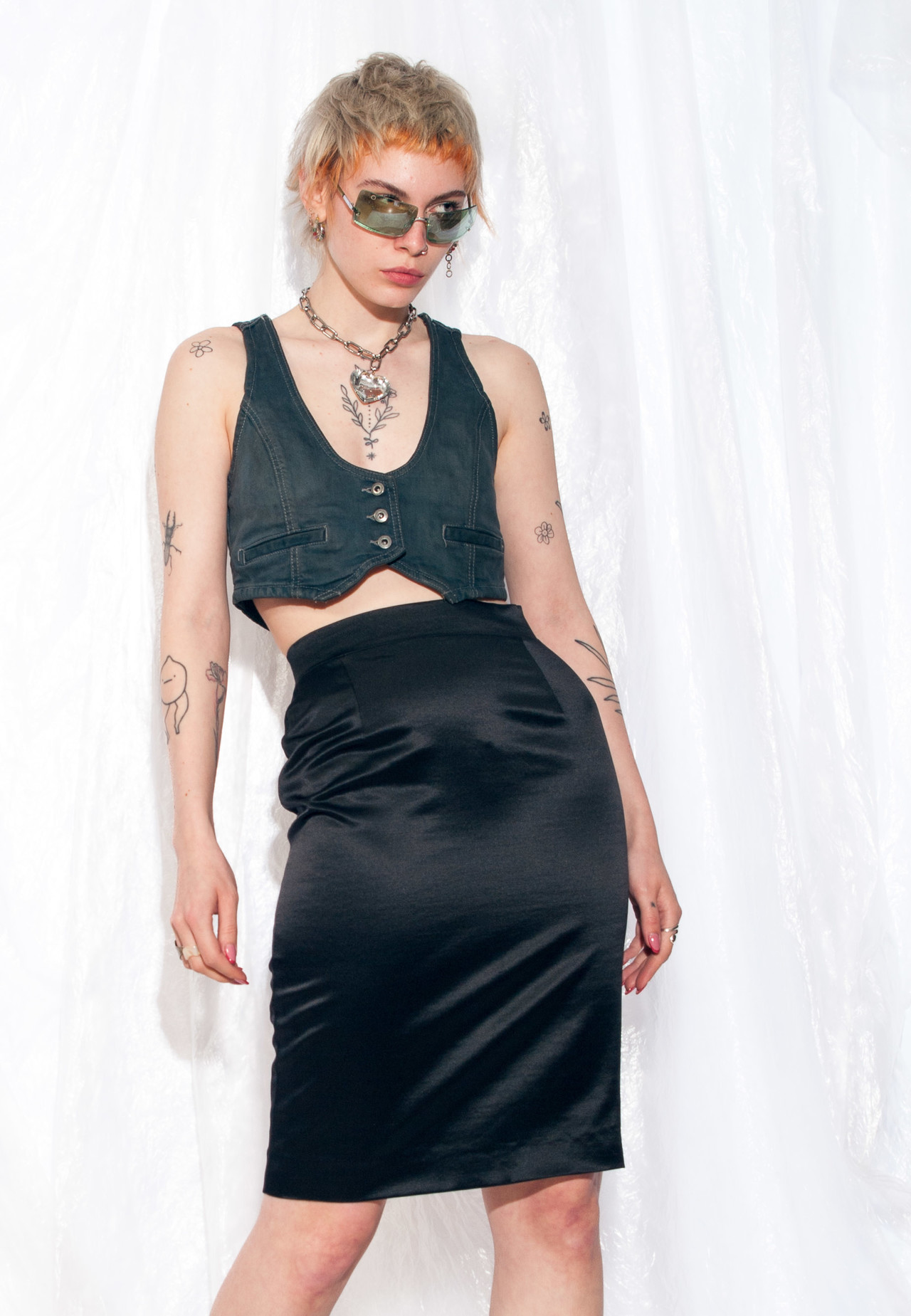Be the first to review “Vintage Ferre Skirt 80s High Rise Pencil Midi in Black Satin” Cancel reply