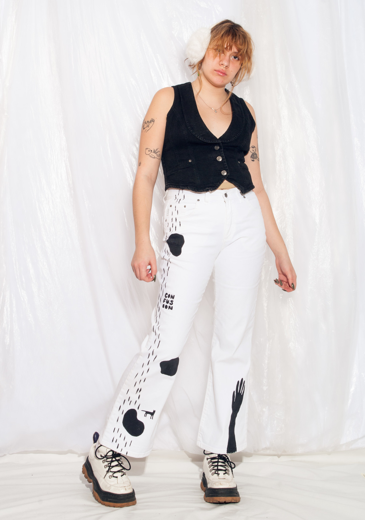 Vintage Flare Jeans Y2K Reworked Painted Trousers in White