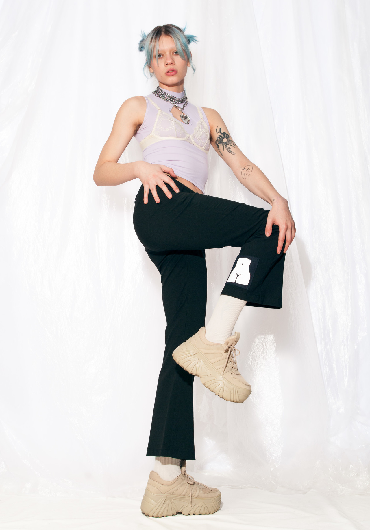 Reworked Y2K vintage trousers are proof that sustainability is not only earth-friendly but also fashionable. These flares are black and zipped. And as for the material, it’s easy-to-care and natural-feel viscose blend. Now with a screen-printed feminist patch, these pants are ready to support political movements.