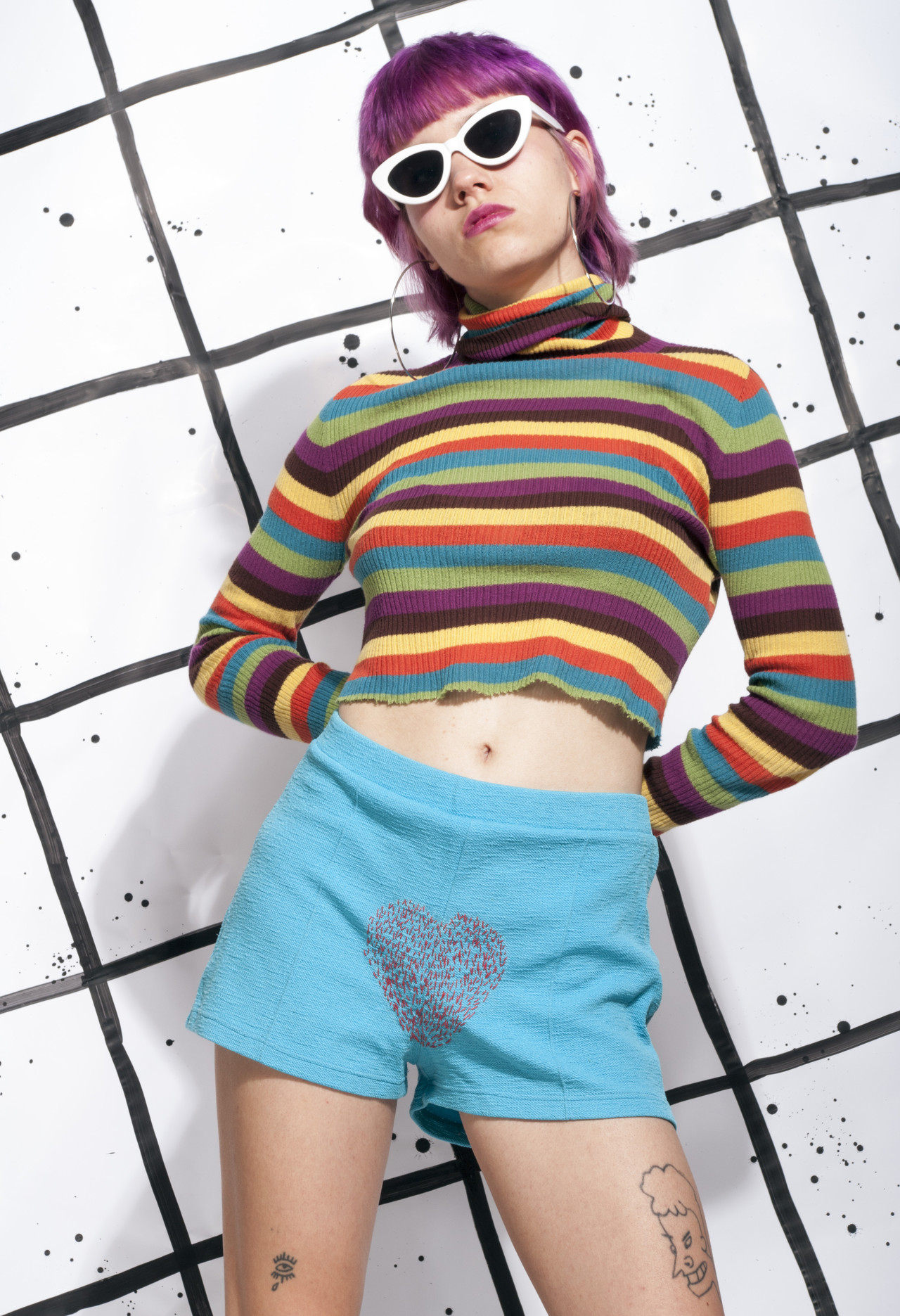 Pop Sick reworked high-waisted shorts with an ultimately cool hand-embroidered decoration. These real vintage babes escaped from the 70s in great condition. Featuring the comfiest stretchy fabric. Pair them with chunky sneakers for a real killer look.