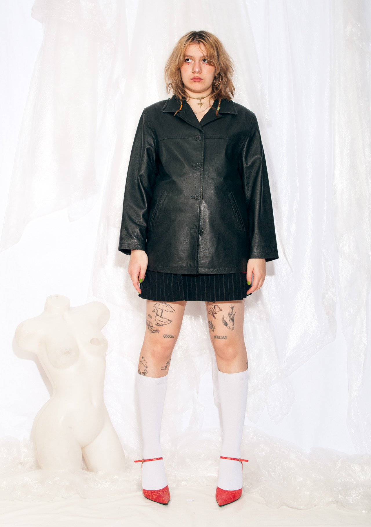 90s vintage leather jacket. This coat will have you looking fly while reducing your carbon footprint. With five pockets to hold all your essentials and a button closure, it’s the perfect mix of practicality and 90s radness.