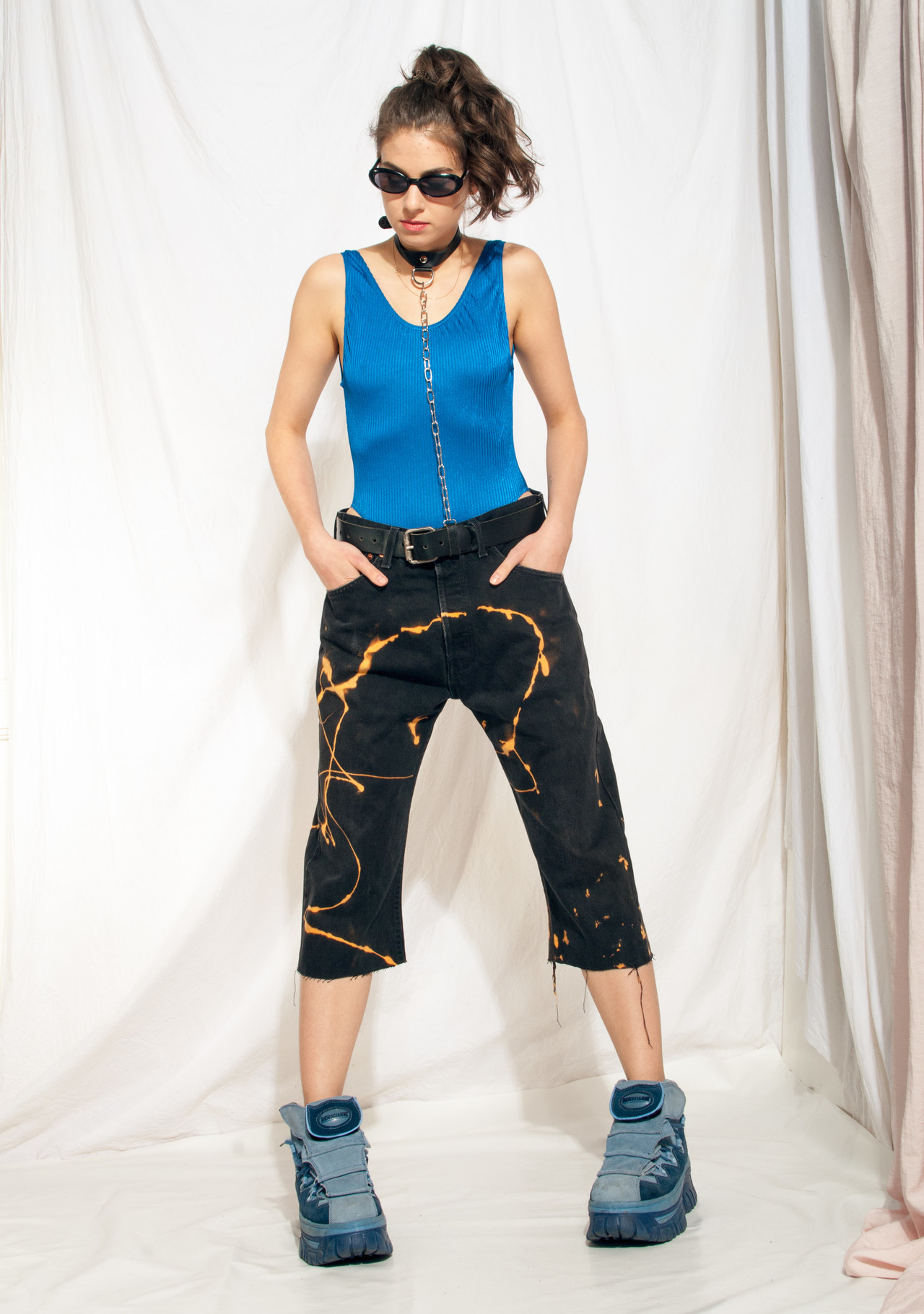 Levi’s denim shorts! Levi’s denim shorts! Is there anything cooler than Levi’s denim shorts? Yes: reworked Levi’s denim shorts! Luckily, this item is no exception to this rule. Made of black denim, this babe comes with a rad bleach-painted pattern. It has five pockets and button closure. Made in the UK. Style: Levi’s 590. Save the planet, switch to vintage now!