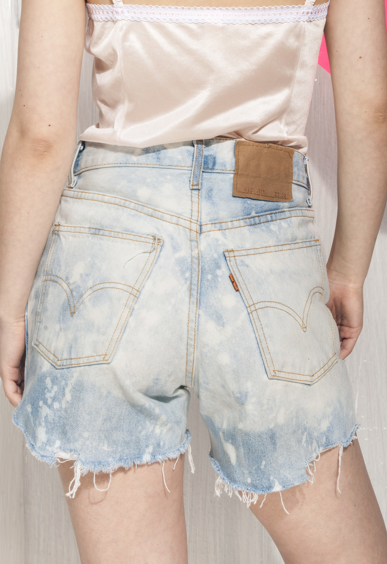These reworked vintage denim shorts are cool like nothing was before. We bleached and distressed them to get this awesome look. Featuring a zip closure, a classic five-pocket styling with an extra high waist and an orange Levi’s tab. It arrived straight from the 80s in great vintage condition.