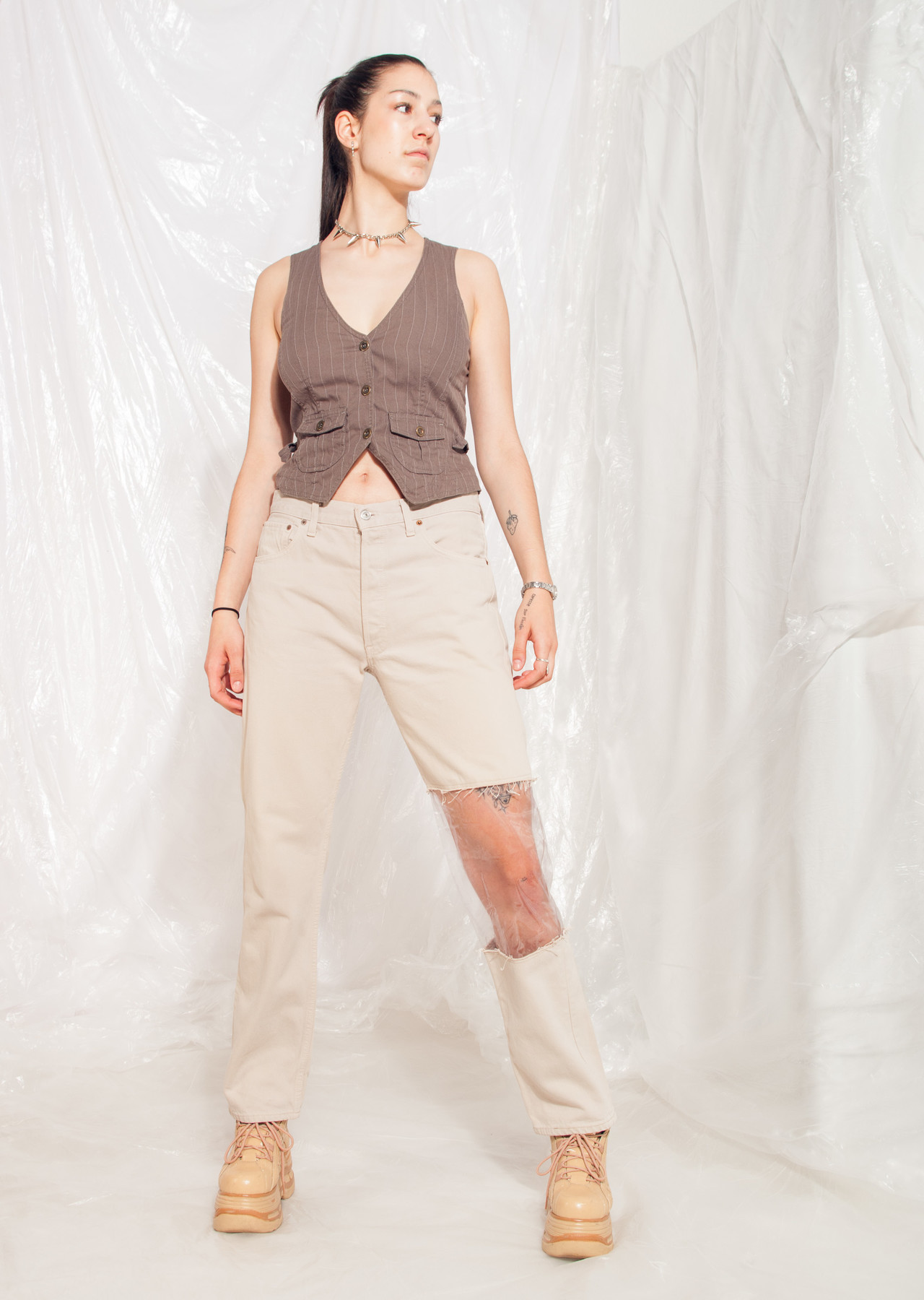 Pop Sick reworked vintage Levi’s jeans with a see-through PVC panel. Feel the 90s vibe? Yup. Comes to you in great condition, closes with buttons at the front. Its five pockets complete its beauty. Don’t hesitate, grab this one-off piece of reworked clothing before someone else does! For an EU size 40-42 depending on the desired fit.