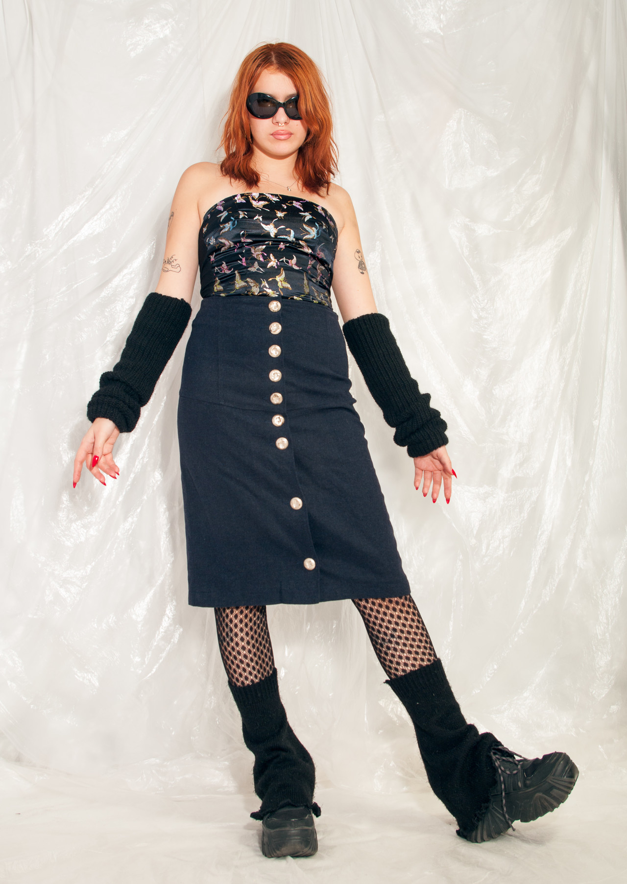 A vintage pencil skirt that arrived from the 80s in mint condition. Made of dark blue wool fabric, this piece features a high-waisted cut and silver buttons on the front. It’s fully lined. Grab this gem before someone else does.