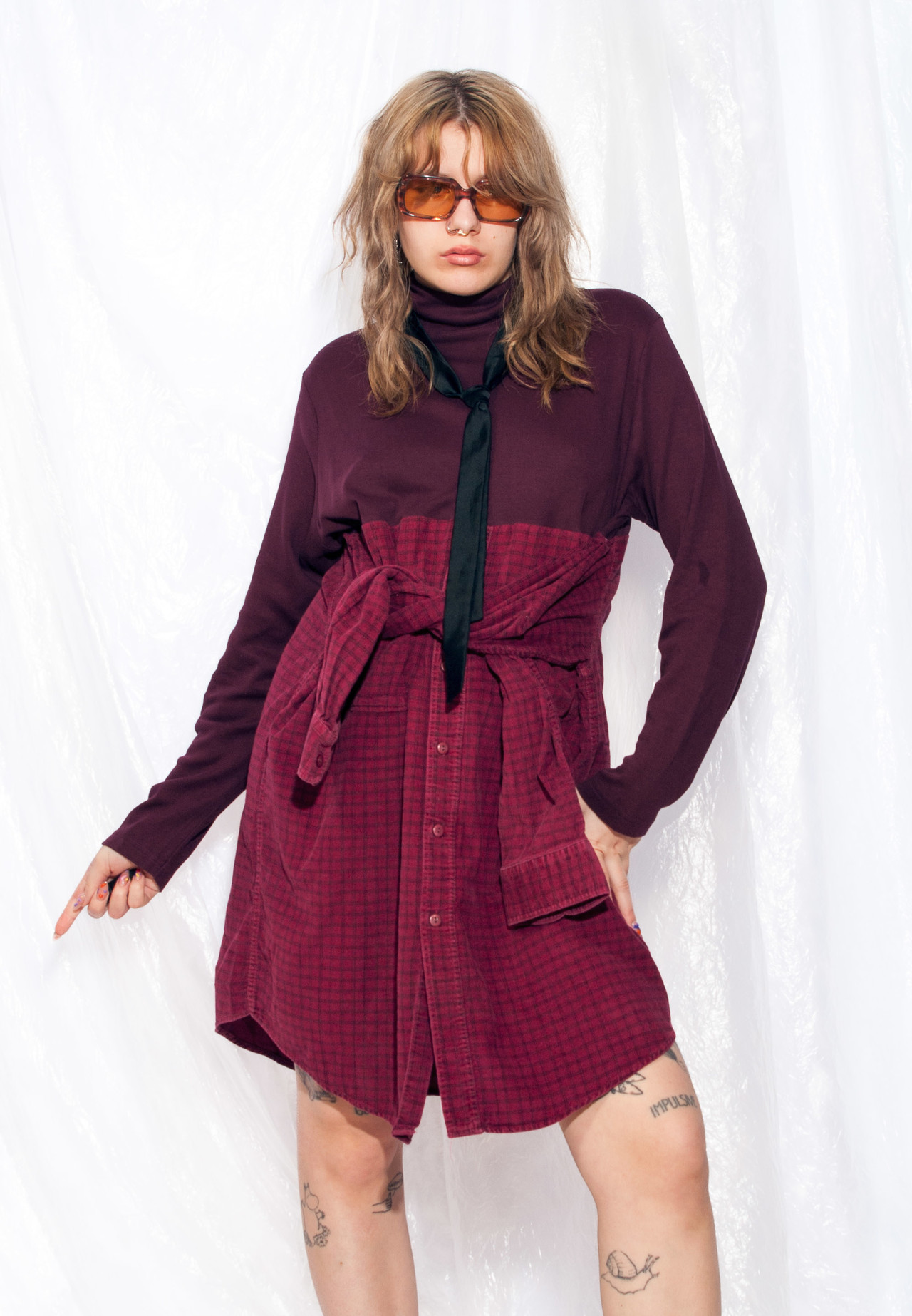 Reworked vintage dress that we made combining a cotton top and a checked corduroy shirt. It can be tied at the front or back, and it’s perfect if you happen to have four arms. Go and wrap your fine body into sustainable fashion.