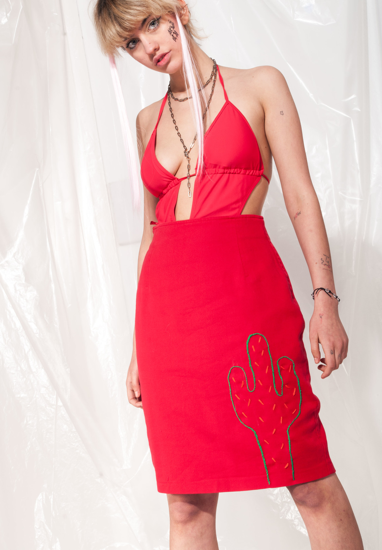 This red vintage skirt came through our time tunnel straight from the sunlit 90s in really good condition but it looked a bit boring, so we hand-embroidered a colour-crushing green cactus on it. It features a zip closure and natural yet easy-to-care cotton blend fabric.