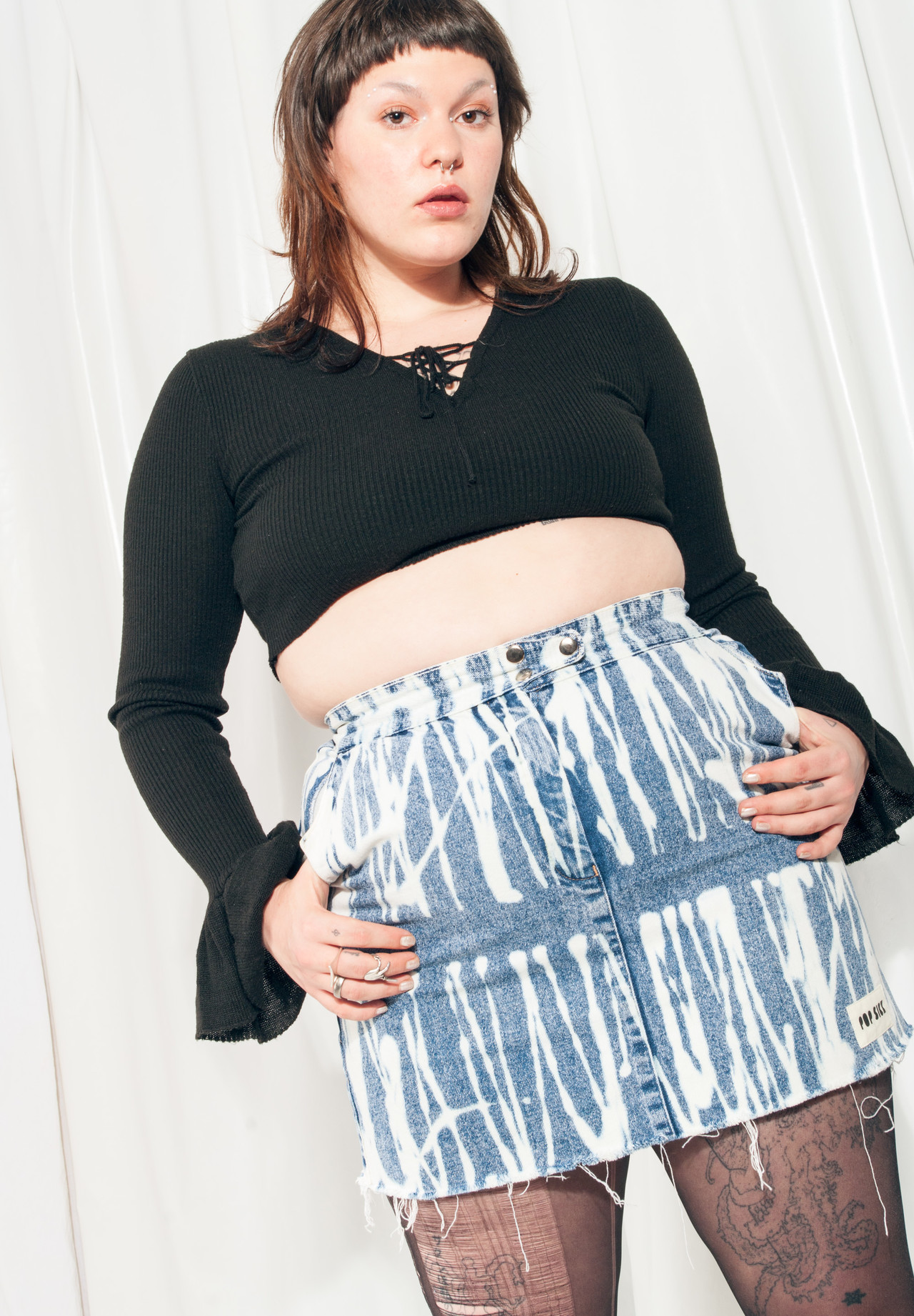 Rad reworked vintage denim skirt, a 90s masterpiece still in great condition. After bleach painting it, we cropped it to perfection. It rocks a high-waisted cut with two front pockets and a zip closure. Please help this vintage cutie to find a new home in your wardrobe!