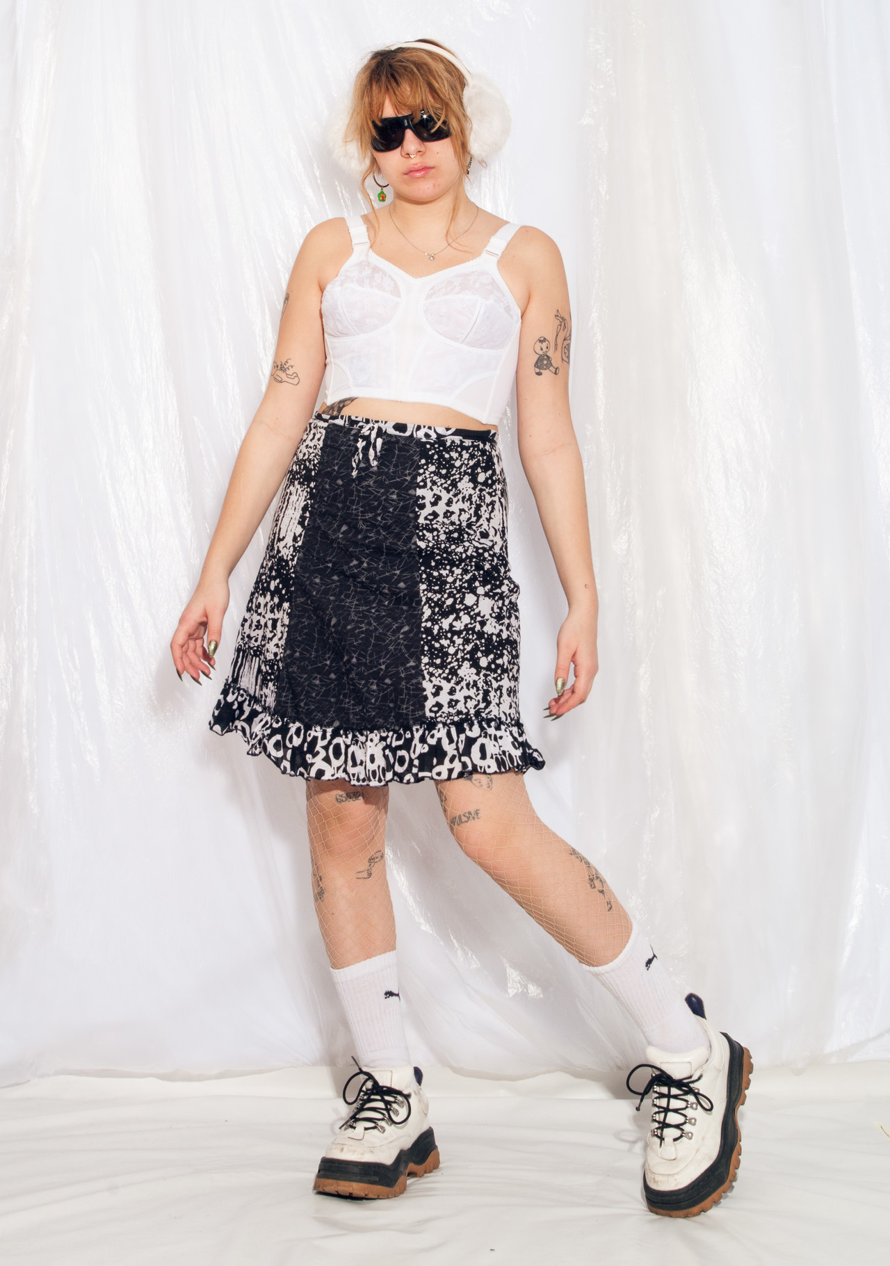 Vintage Skirt Y2K Frilly Monochrome Printed Cotton Midi
