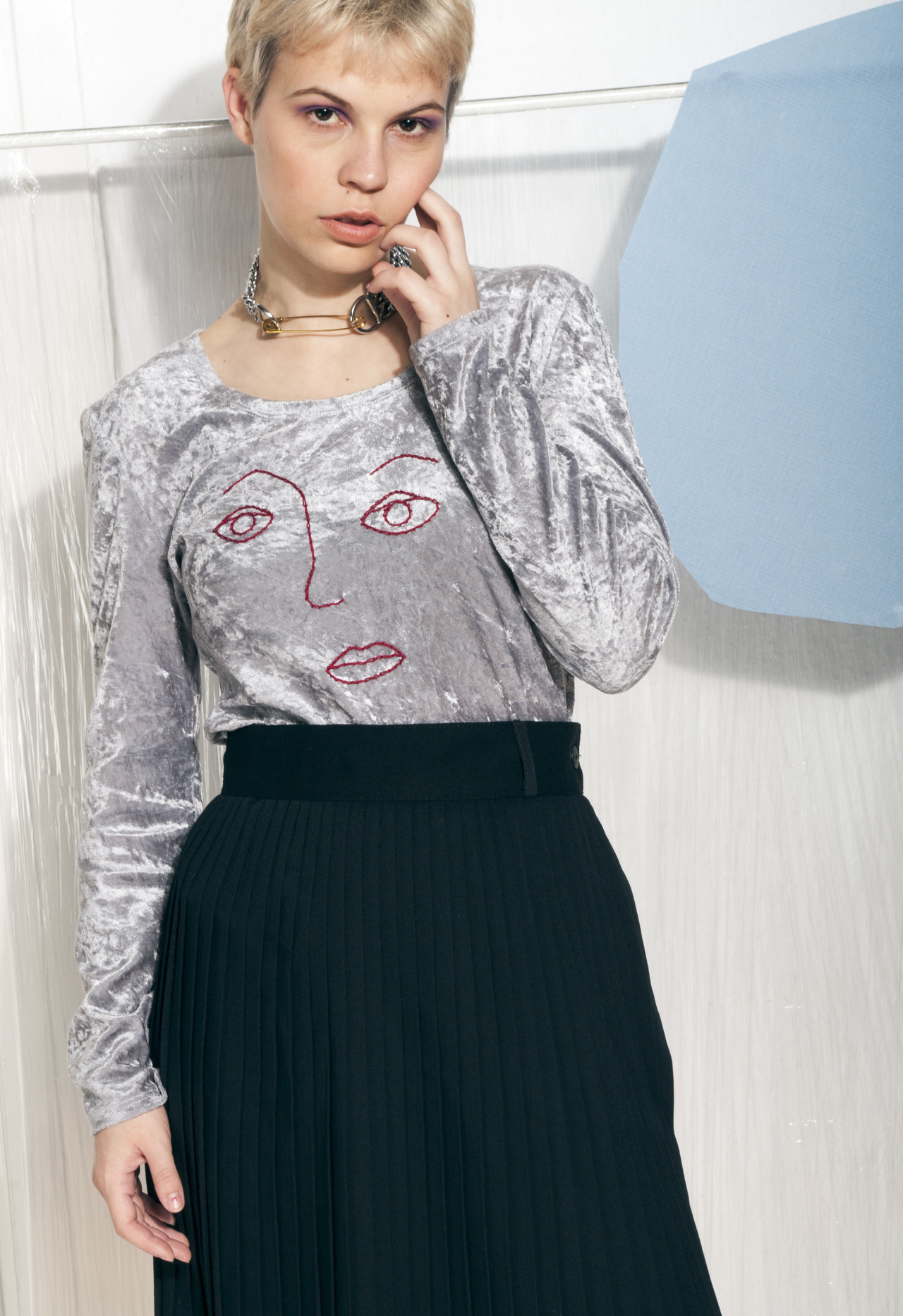 Reworked vintage silver velvet top with a hand-embroidered weird face pattern. It’s a real vintage babe that escaped from the 90s in flawless condition. It’s a one-off piece. Go go go!