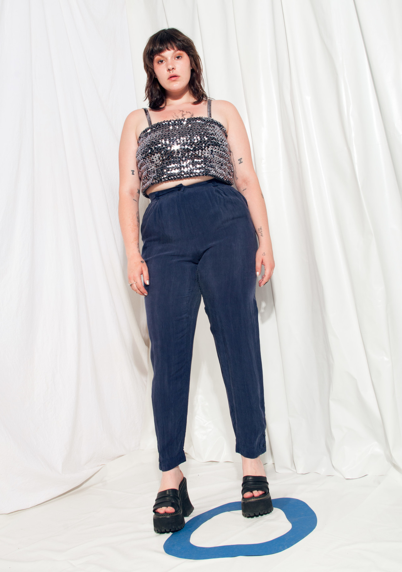 Be the first to review “Vintage Trousers 80s High-waisted Silky Blue Tapered Pants” Cancel reply