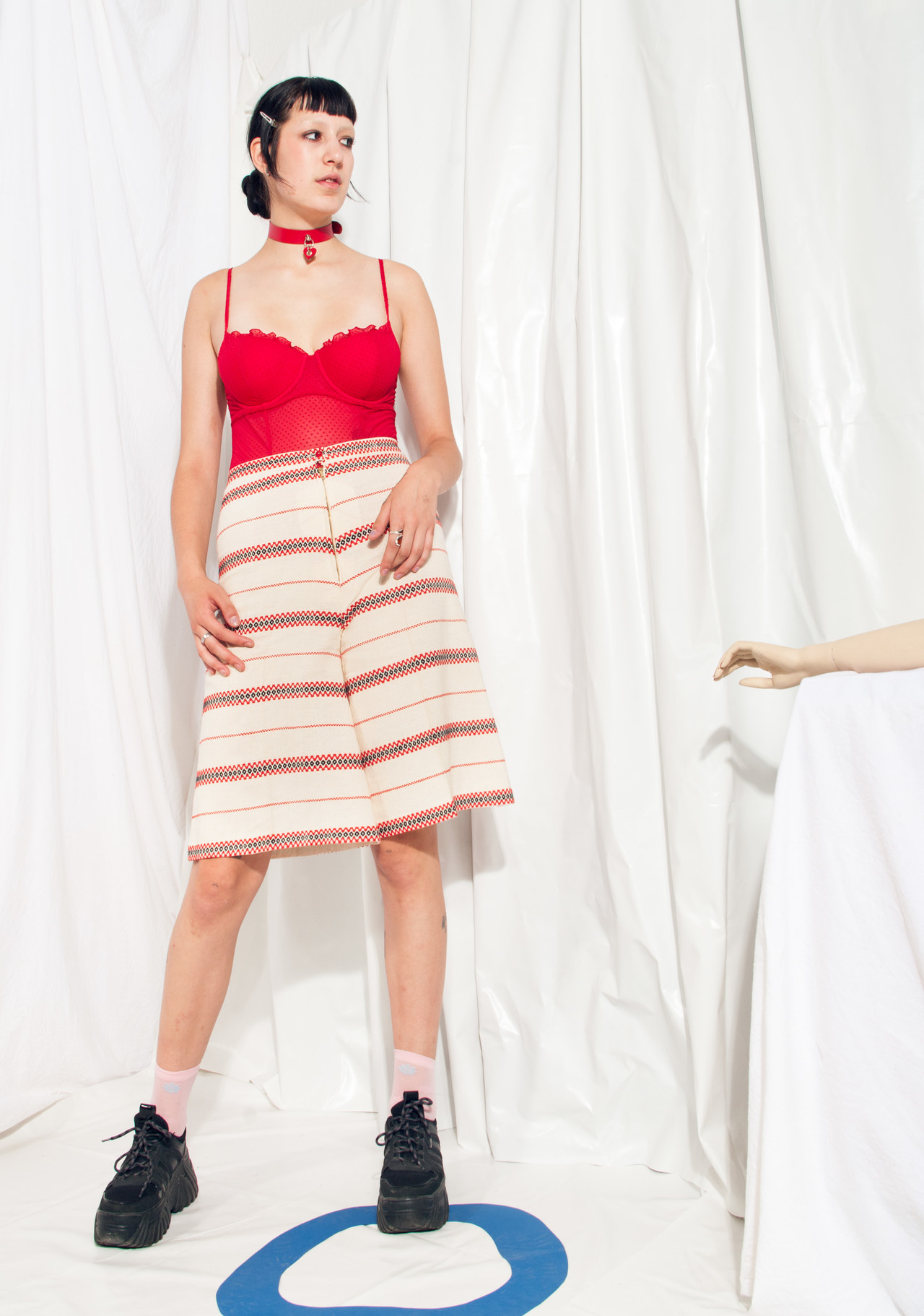 Rare woven cottagecore folk shorts that are not that short — straight from the 40s in surprisingly good condition. It’s unlined and it closes with a copper zip and a single button on the front. It’s made of vowen linen fabric.