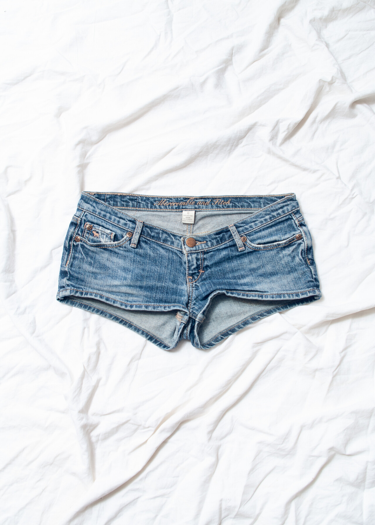 Tags: 2000s style clothing, Abercombie & Fitch, denim micro shorts, hot pants, low rise waist, stonwashed jeans, y2k grunge outfit, y2k vintage fashion