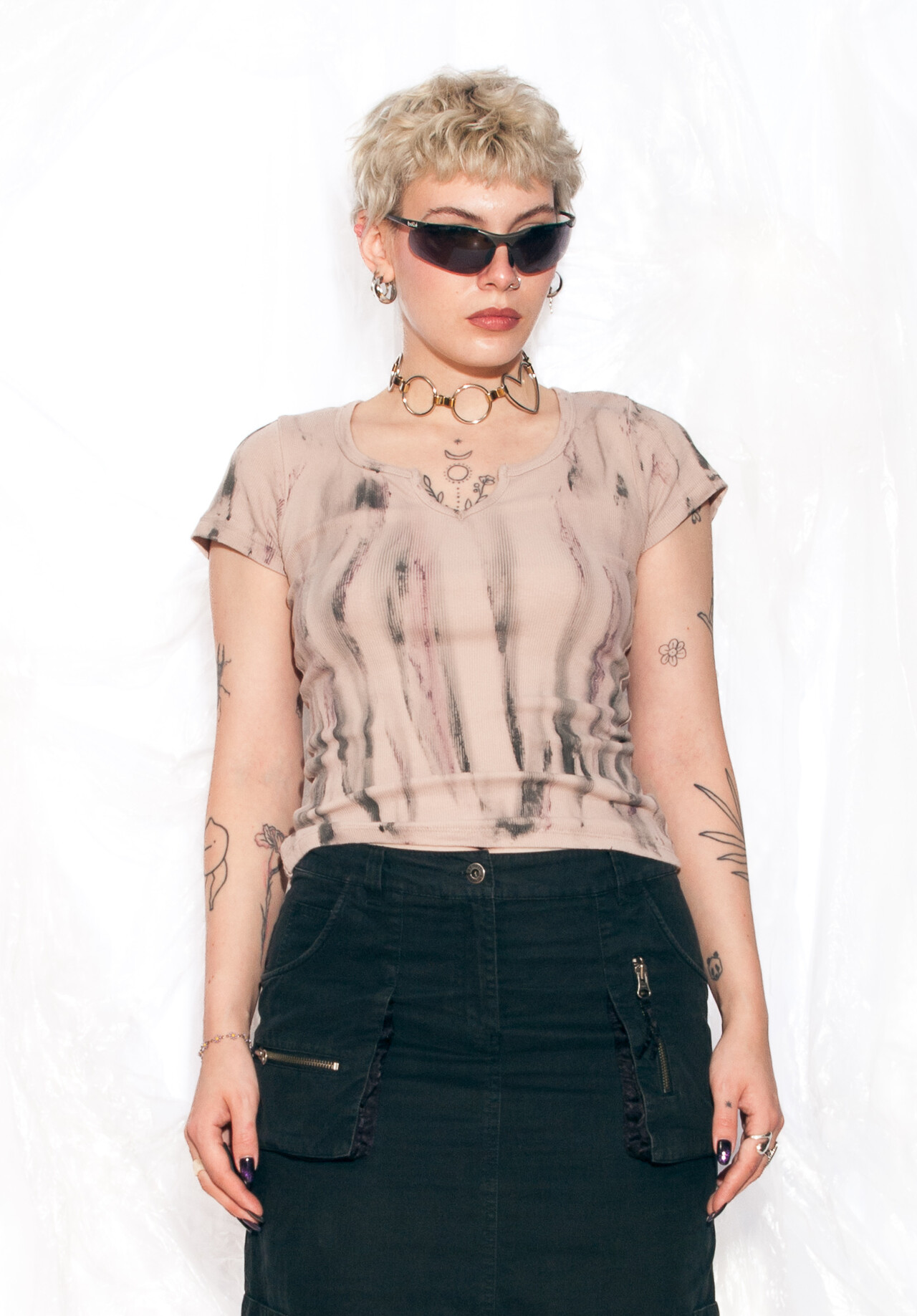Vintage Y2K Baby Tee in Beige Reworked Hand-Painted