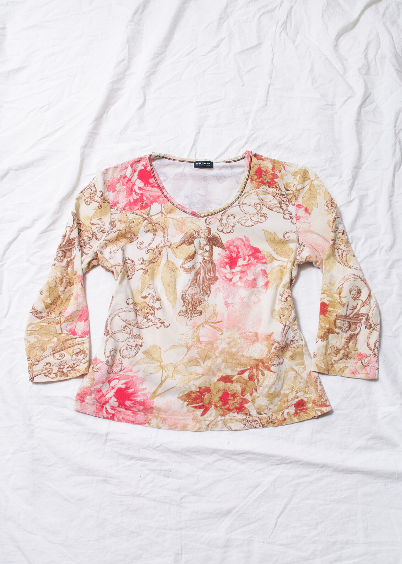 Tags: 2000s style clothing, angelcore, baroque print, boho aesthetic, long sleeve baby tee, pinterest outfit, slim fit top, stretchy cotton top, whimsigoth, y2k vintage fashion