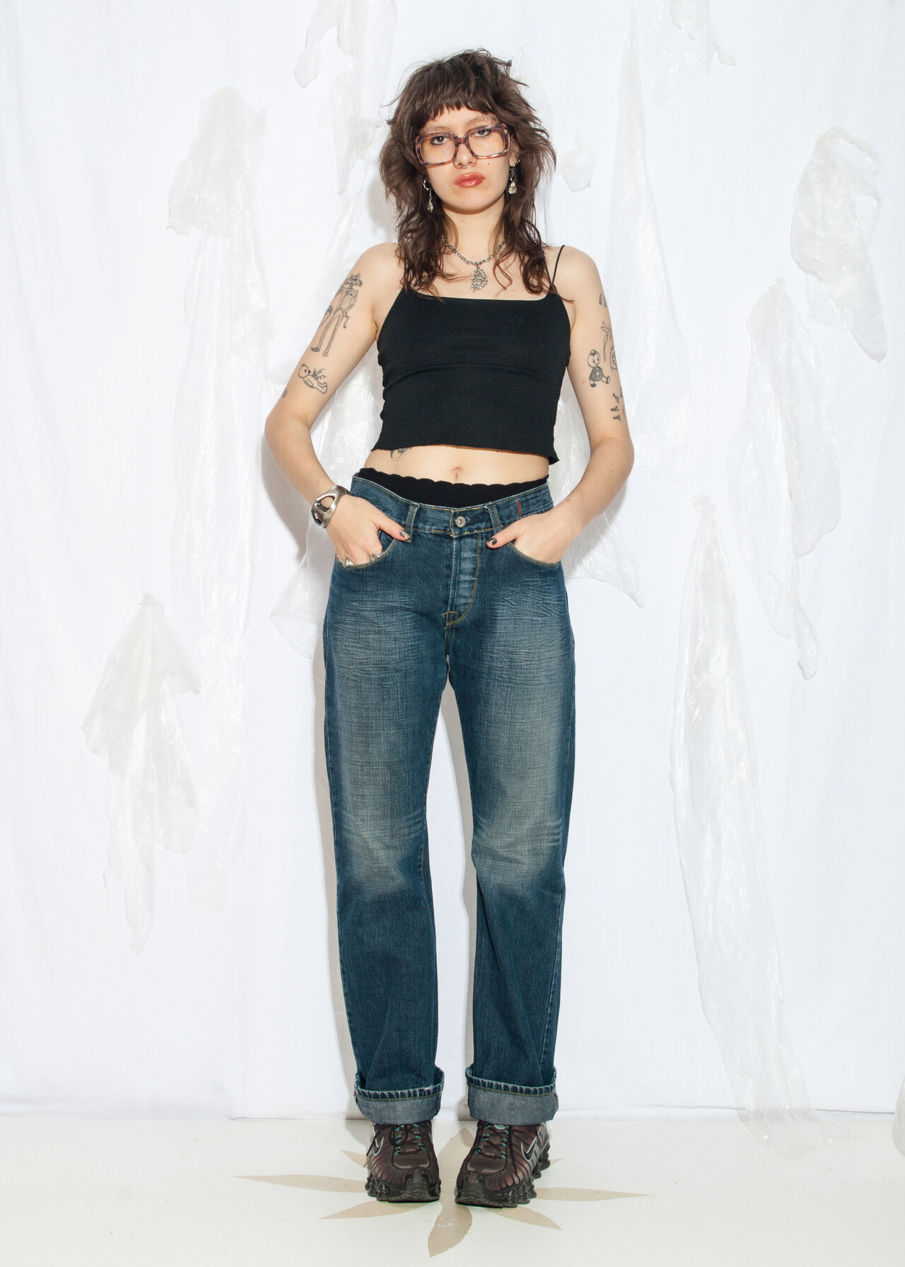 Tags: 2000s vintage fashion, boyfriend cut pants, gender neutral, low waisted trousers, slouchy jeans, stonewashed denim, y2k grunge outfit, y2k style clothing