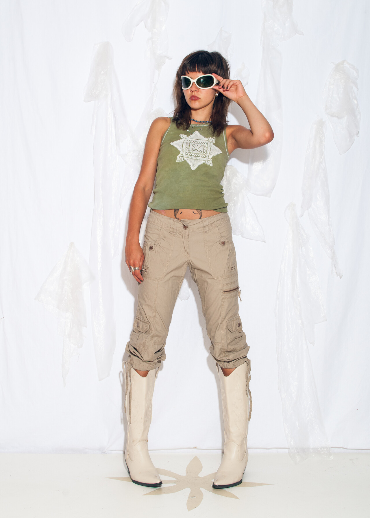 Tags: 2000s style clothing, beige cotton, cargo capri pants, low rise waist, pocketed trousers, y2k grunge outfit, y2k vintage fashion