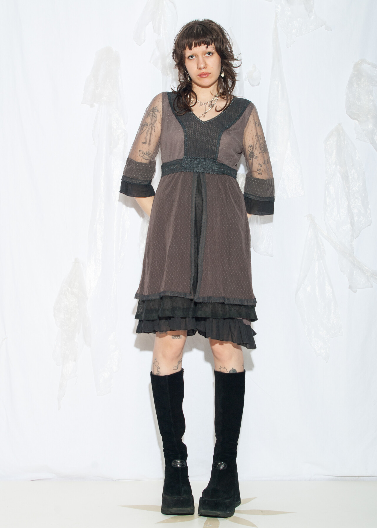 Tags: 2000s style clothing, acubi style, Alice Cullen, dark coquette, frilly ruffle dress, romantic mesh dress, y2k vintage fashion