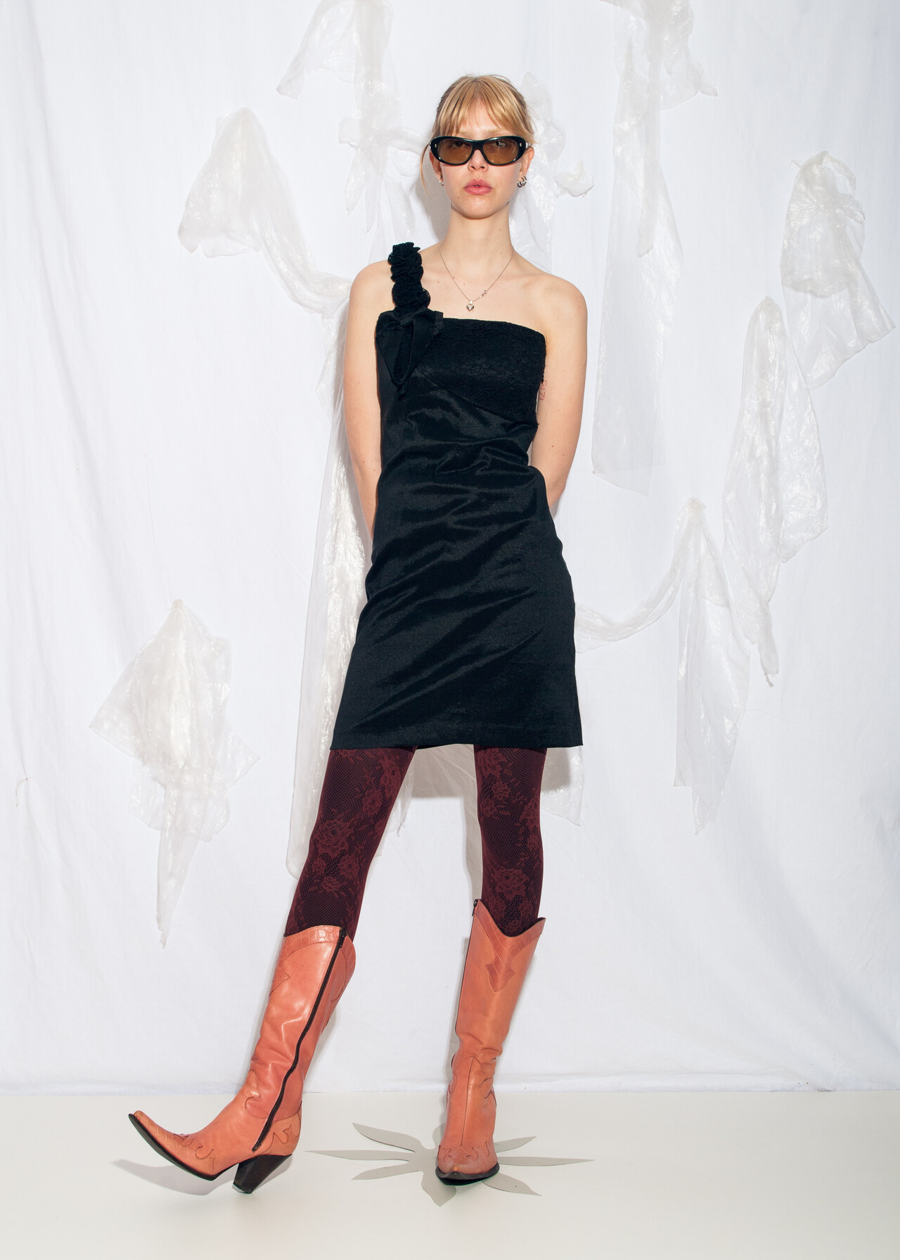 This Y2K vintage dress is your ticket to a prom party gown extravaganza that screams “I woke up like this” with its lace bow detail and little black dress allure.