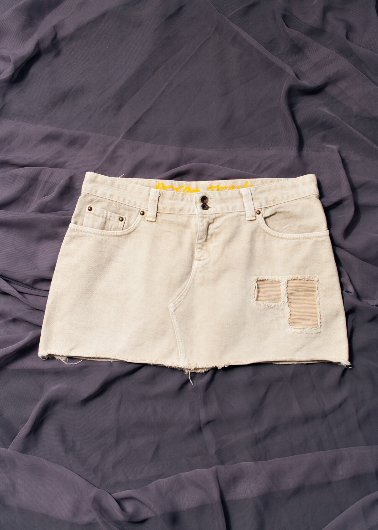Tags: 2000s style clothing, beige cotton skirt, denim micro skirt, distressed jeans, low rise waist, raw hem mini skirt, y2k grunge outfit, y2k vintage fashion