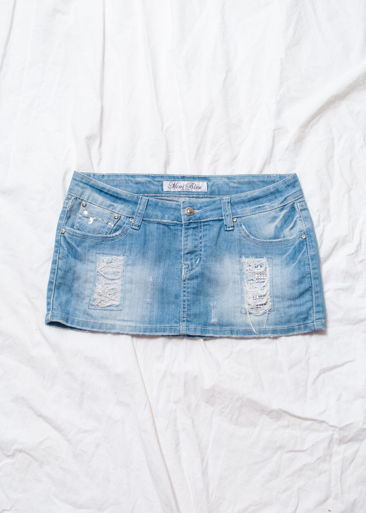 Tags: 2000s vintage style, denim micro skirt, distressed, low rise waist, Paris Hilton