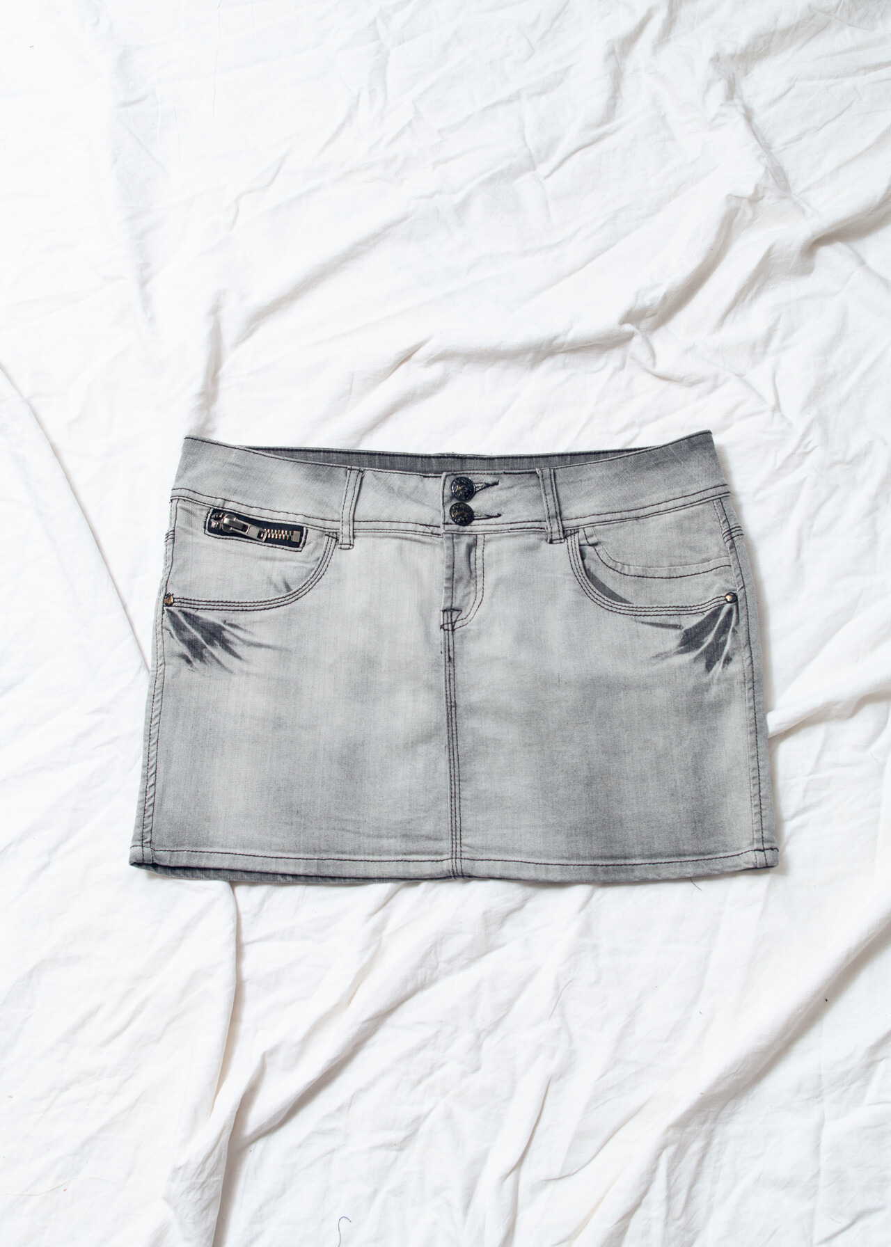 Tags: 2000s style clothing, cyber grunge outfit, denim micro skirt, grey cotton mini, jeans skirt, low rise waist, stonewashed denim, y2k vintage fashion