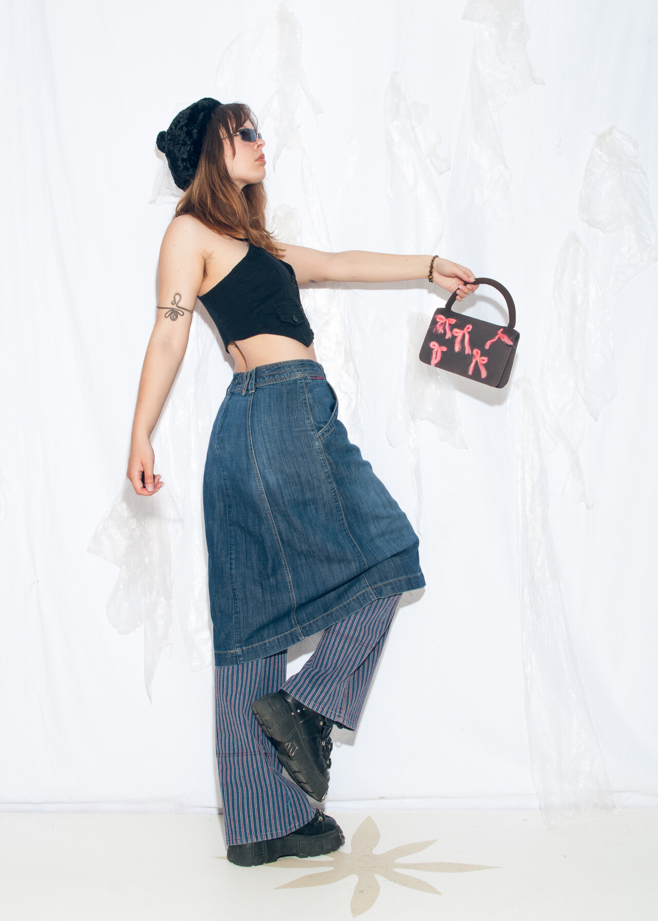 Tags: 2000s style fashion, denim midi skirt, low rise jeans, stonewashed denim, y2k vintage clothing