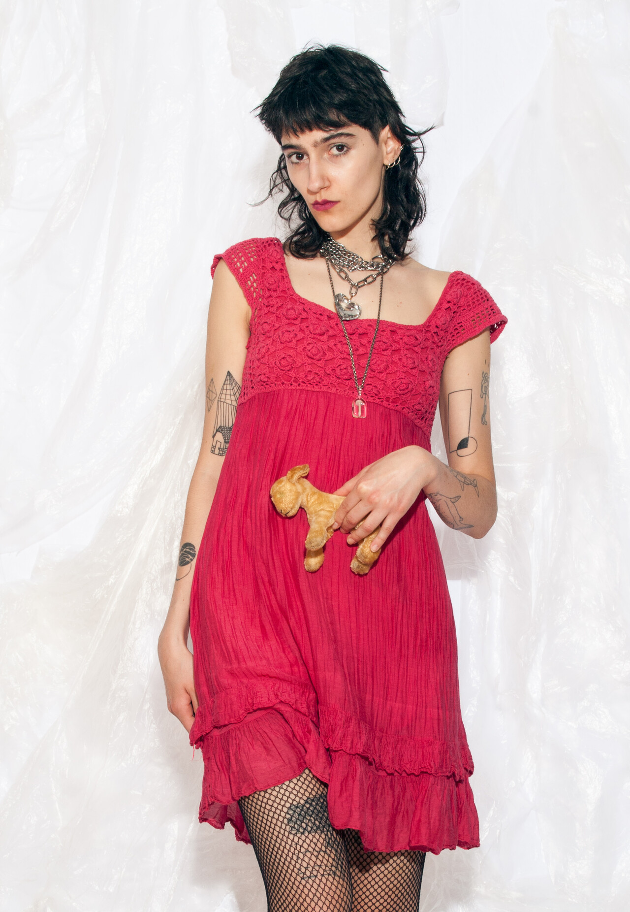 This Y2K vintage silk dress is a fairy dream come true with its crochet detail and frilly creased fabric.