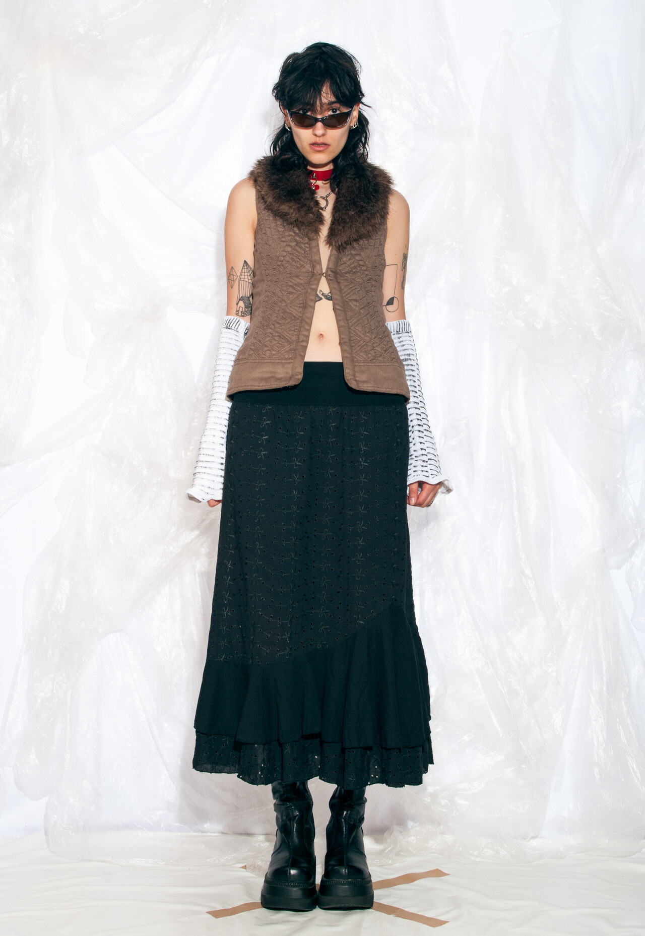 This vintage gilet is a blend of Y2K grunge and whimsigoth vibes with its slim fit and faux fur collar.