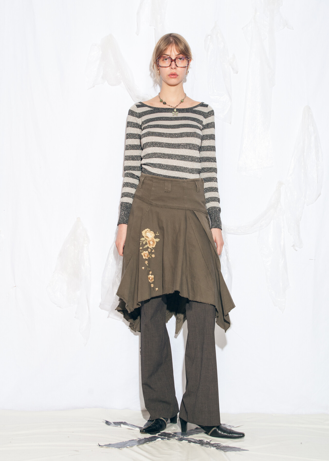Tags: 2000s vintage style, flower embroidery, frilly skirt, khaki cotton, low rise bottom, whimsigoth