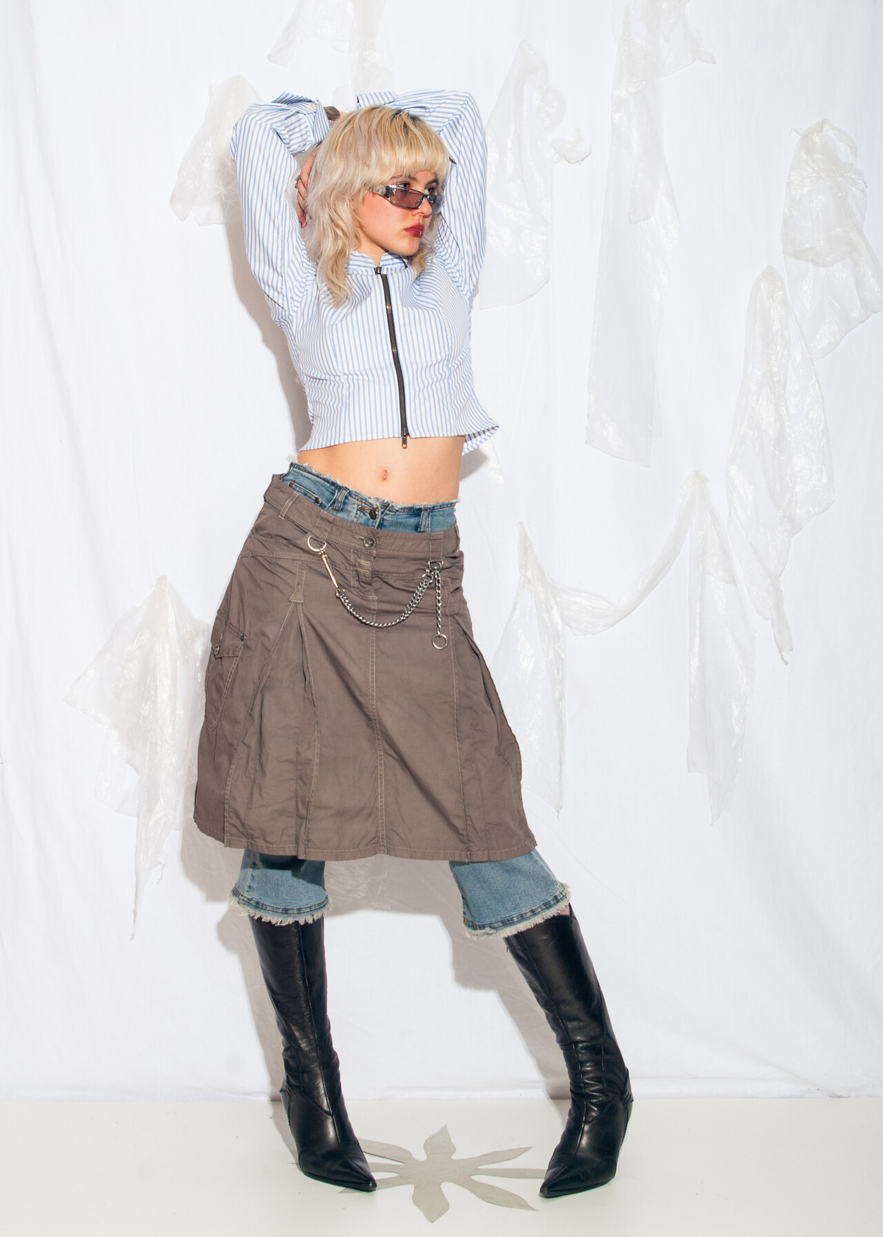 Y2K low rise grunge chain skirt – this cargo midi masterpiece is ready to whisk you back to the days when your biggest dilemma was choosing between brown and grey for the ultimate 2000s style statement.