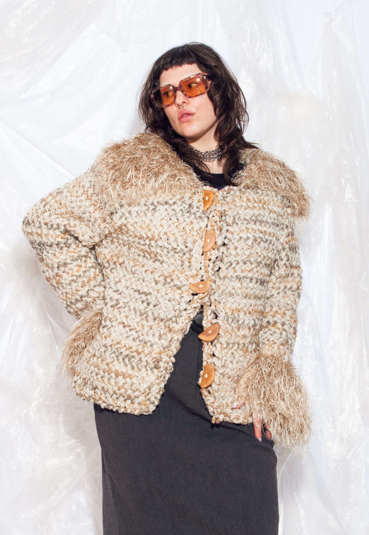 Vintage Y2K Handmade Knit Cardigan in Beige w Furry Collar