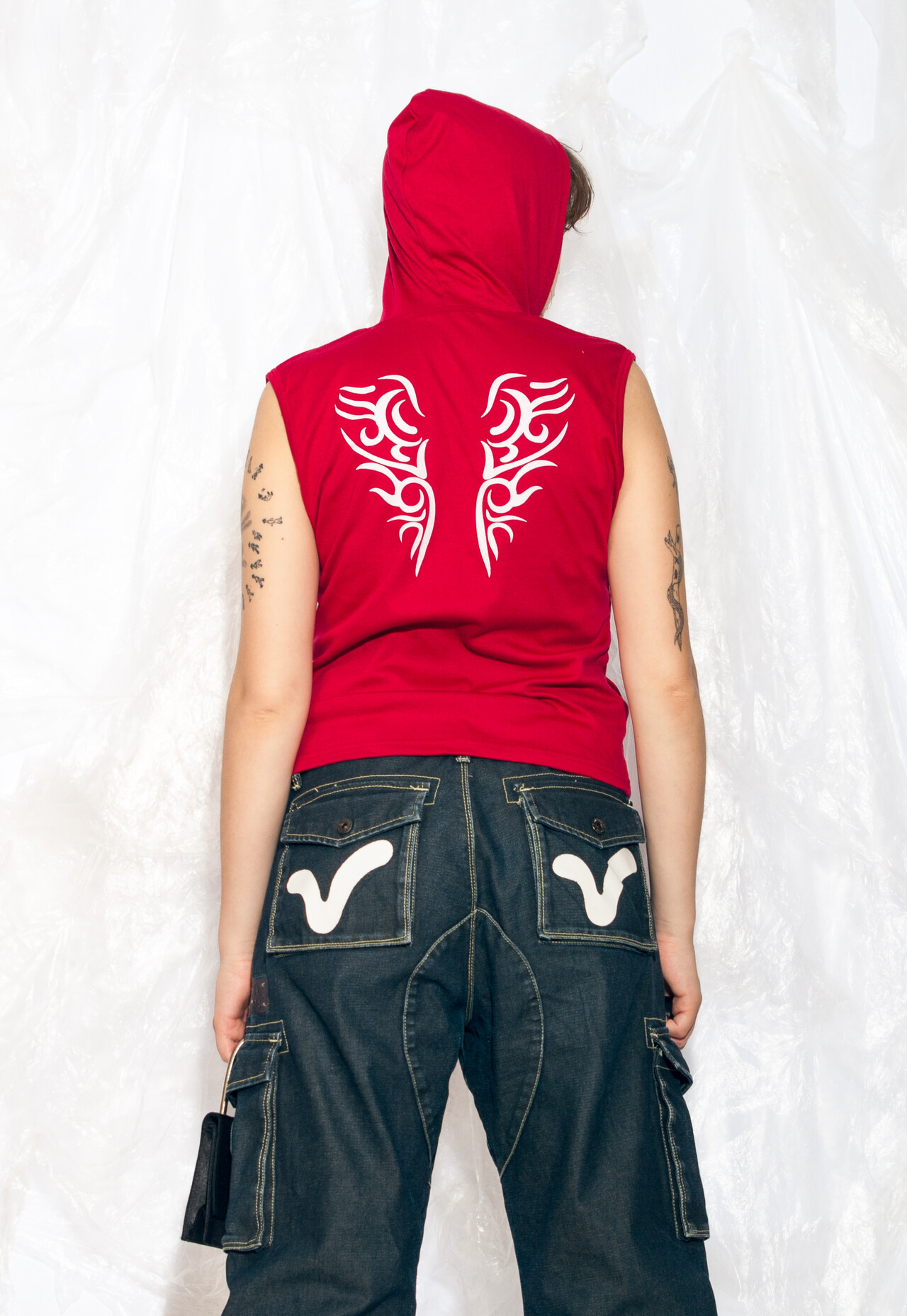 This Y2K vintage vest is like wearing a red, hooded love letter from the 2000s, complete with tribal tattoo vibes.