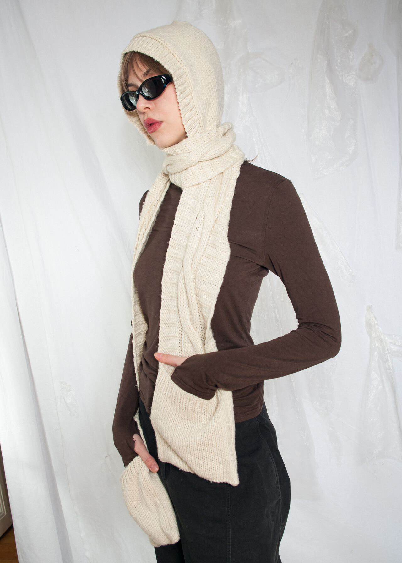 Tags: 2000s style clothing, beige knit accessory, knitted hooded scarf, pocketed scarf, winter hood, y2k grunge outfit, y2k vintage fashion
