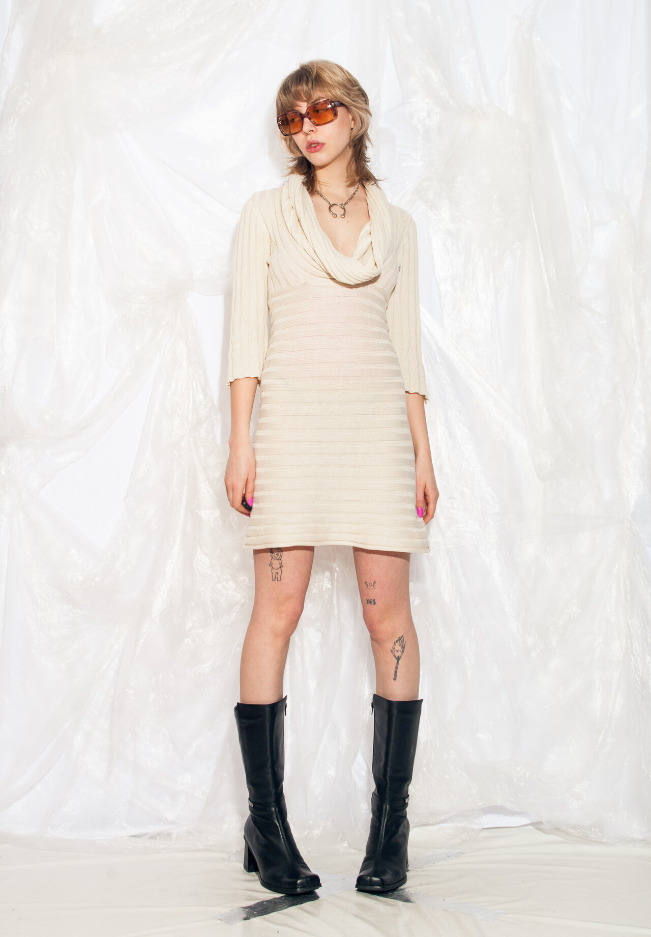 Step into this knitted Y2K vintage dress and transport yourself back to the early 2000s. Watch out for flip phones and flared jeans as you zip up this beige beauty!