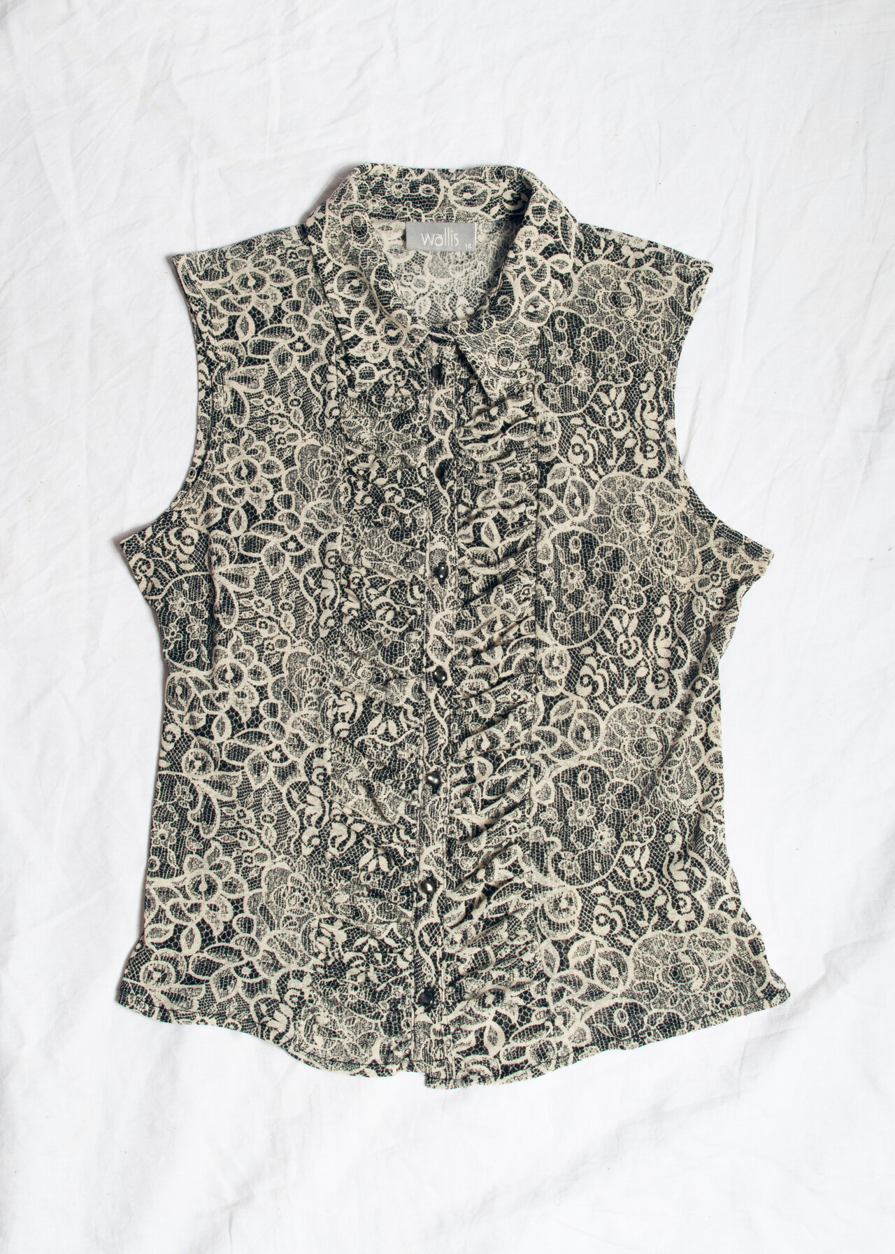 This Y2K vintage top is the lace print blouse you need to channel your inner 2000s diva, sleeveless and ready to party like it’s 2001 in black and beige.