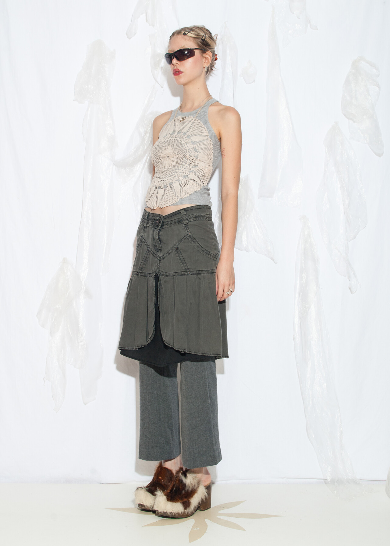 Tags: 2000s style clothing, grey cotton skirt, layered midi skirt, low waist bottom, whimsigoth, y2k grunge outfit, y2k vintage fashion