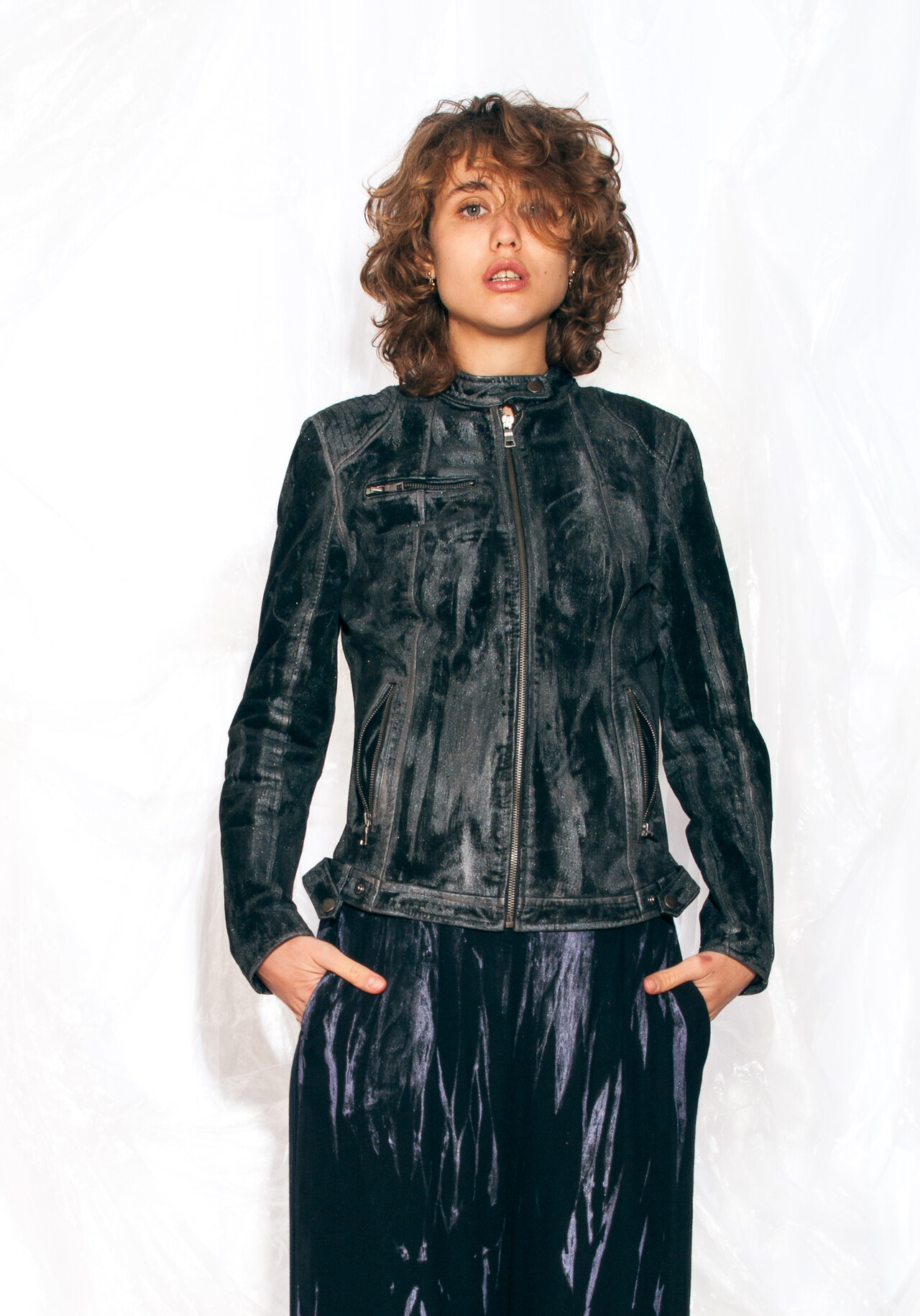 This reworked, hand-painted Y2K vintage jacket is a one-of-a-kind piece. Slip it on, and be the silver icon you were always destined to be, straight outta the early 2000s.