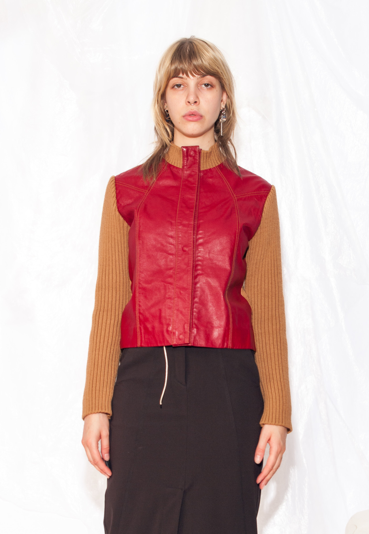 Check out this Y2K vintage jacket in red leather. It’s like wearing a little slice of time-travelling awesomeness. With a snap fastener closure and knitted sleeves, this jacket is ready to make a statement and keep you looking cool without trying too hard.