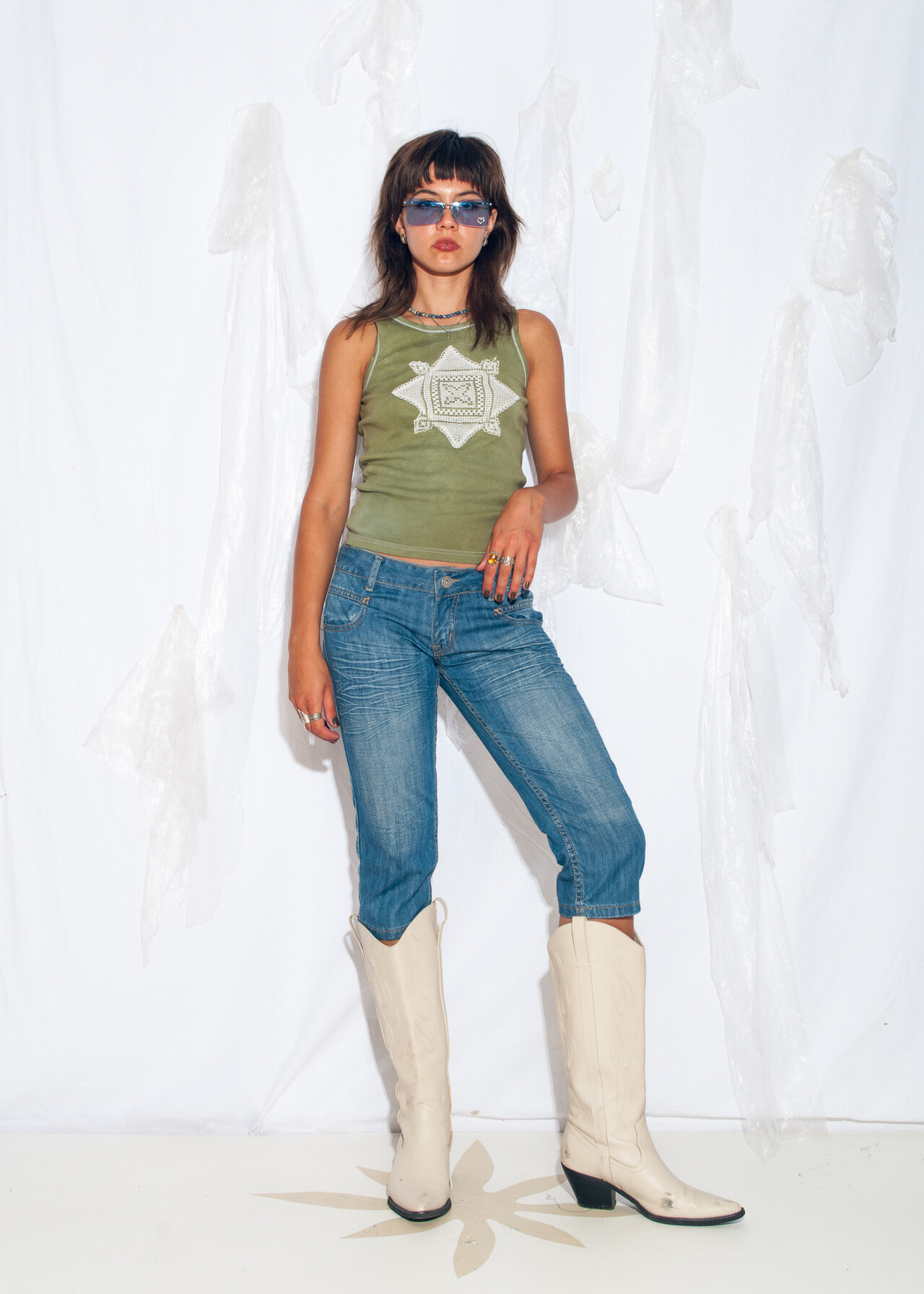 Tags: 2000s style clothing, Ambiguous Jeans, low rise waist, slim fit capri jeans, stonewashed denim, y2k grunge outfit, y2k vintage fashion