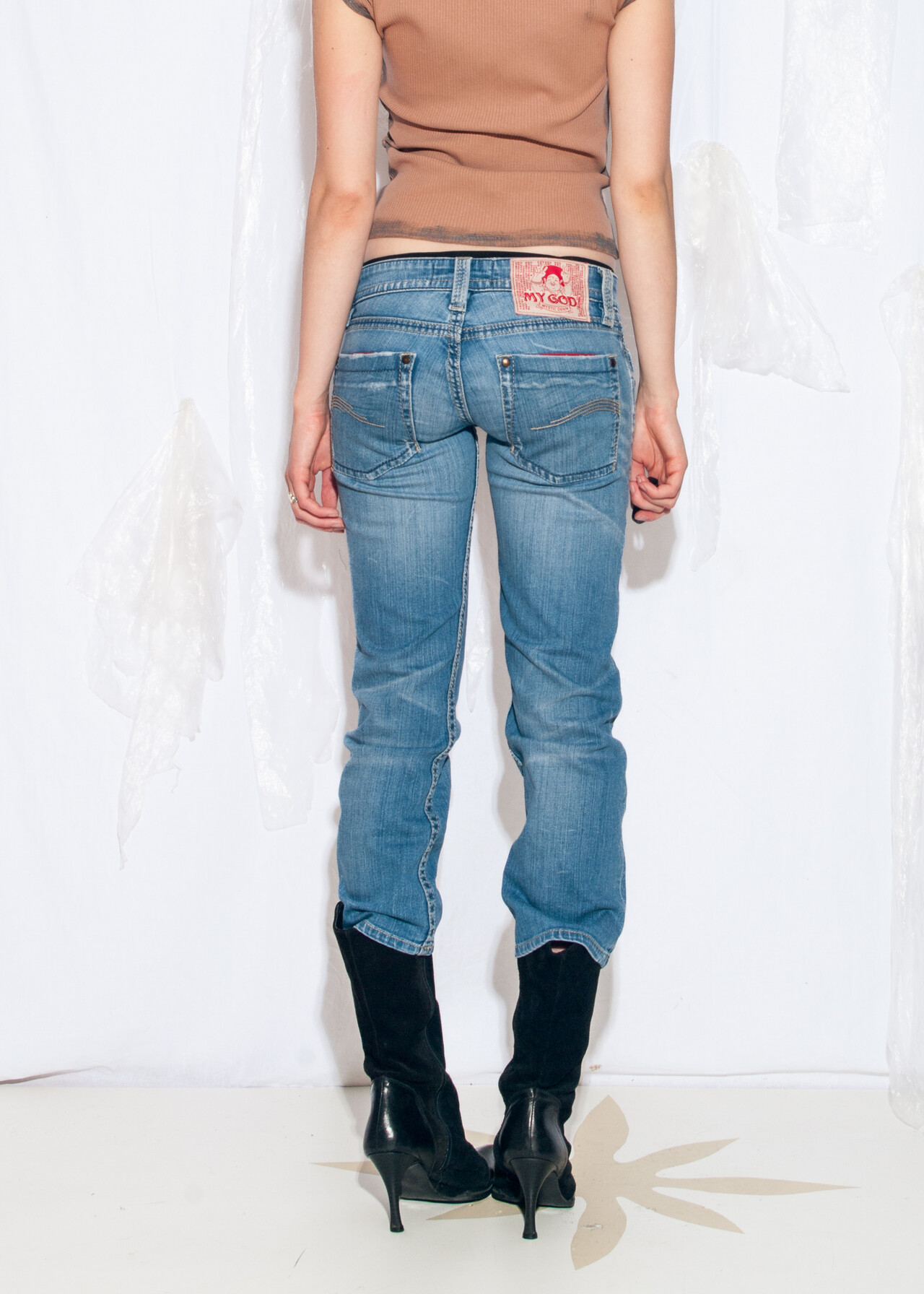 These Y2K vintage low-rise capri jeans by My God! Mystic Denim are the stonewashed gems you need to channel your inner 2000s pop star!