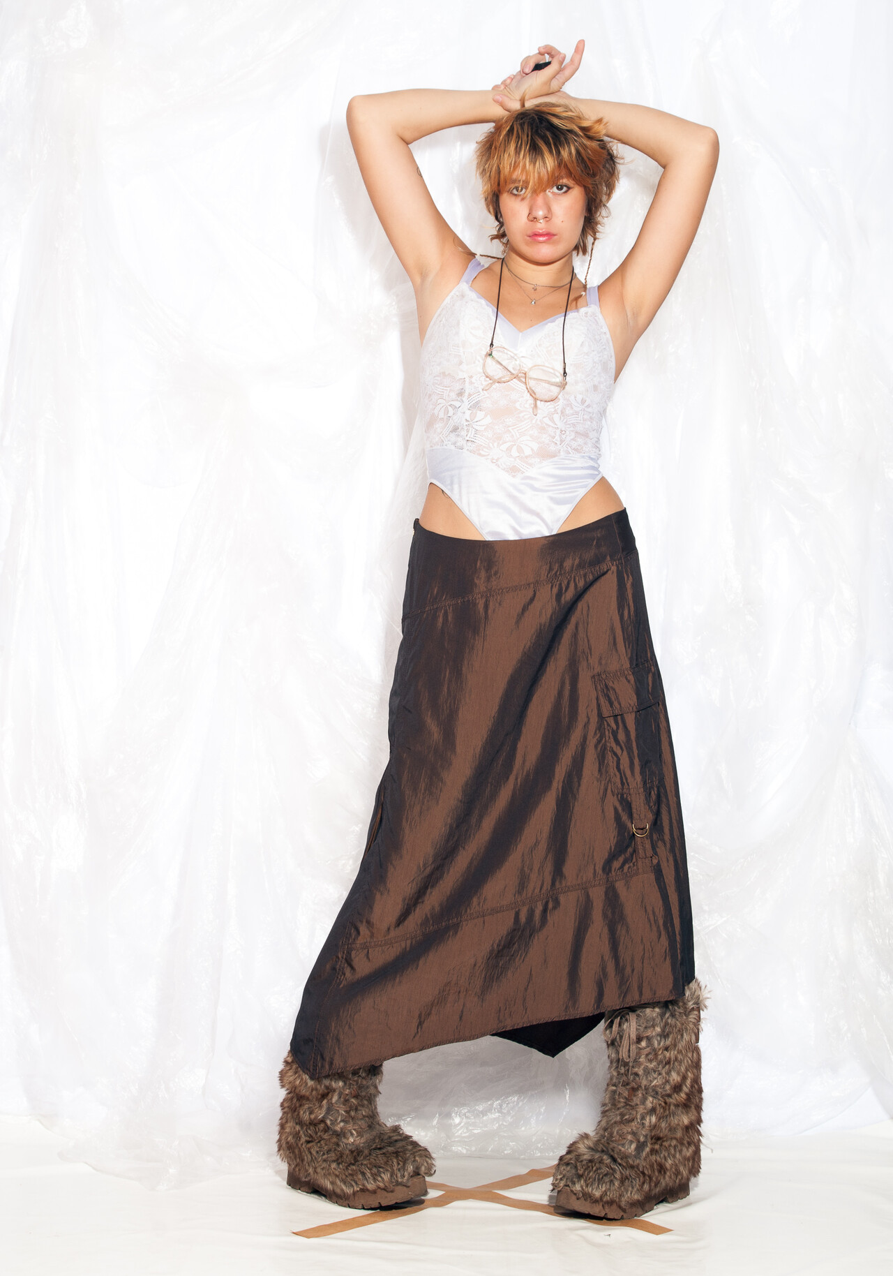 Introducing this Y2K vintage skirt from Green House. With its cargo style and iridescent brown colour, it’s a fashion journey back to the early 2000s.
