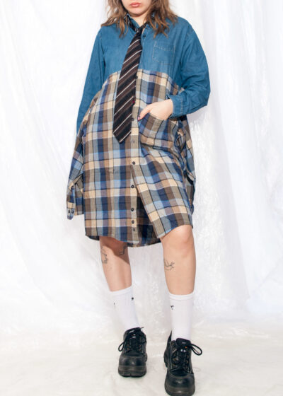 Vintage Shirt dress 90s Reworked Denim Plaid Tie Dress