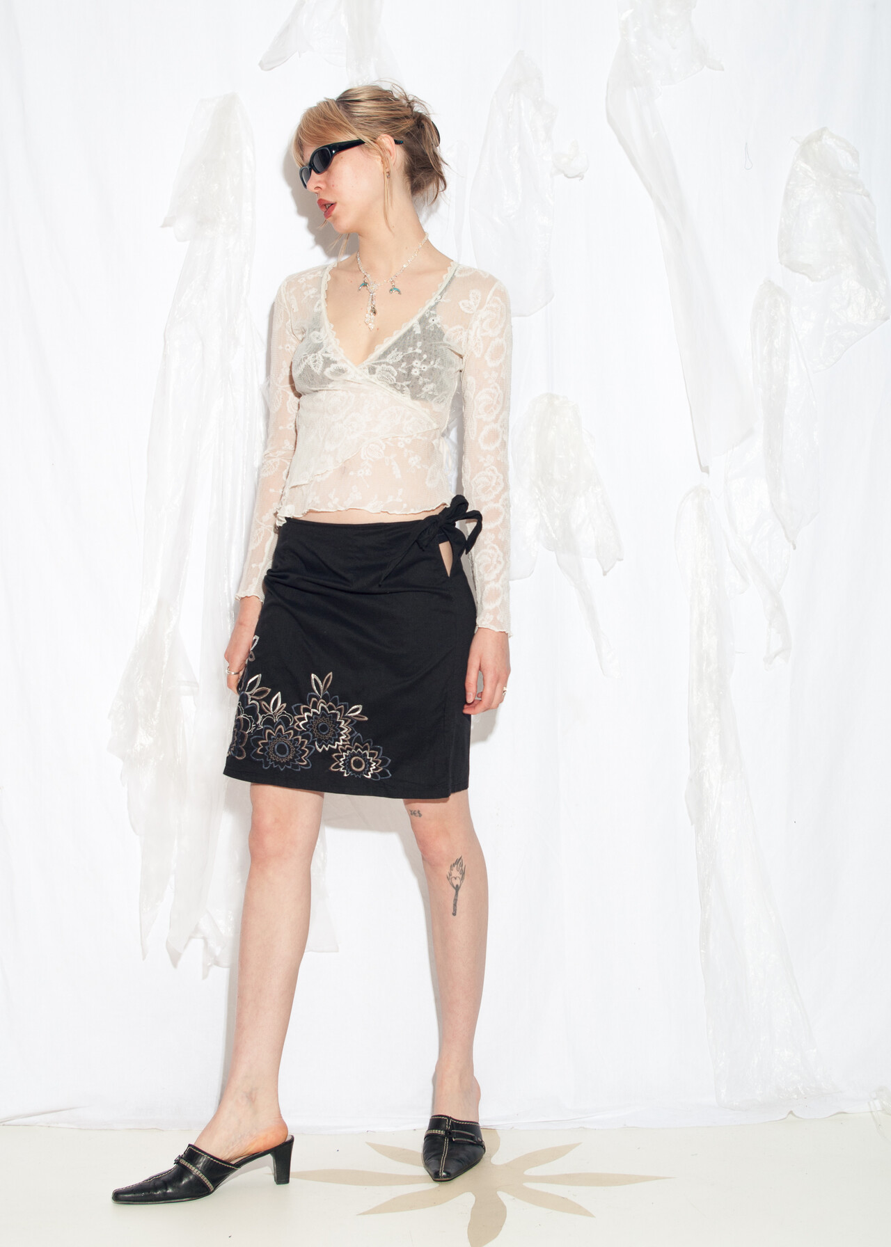 Vintage Y2K Mini Skirt in Black with Embroidered Flowers