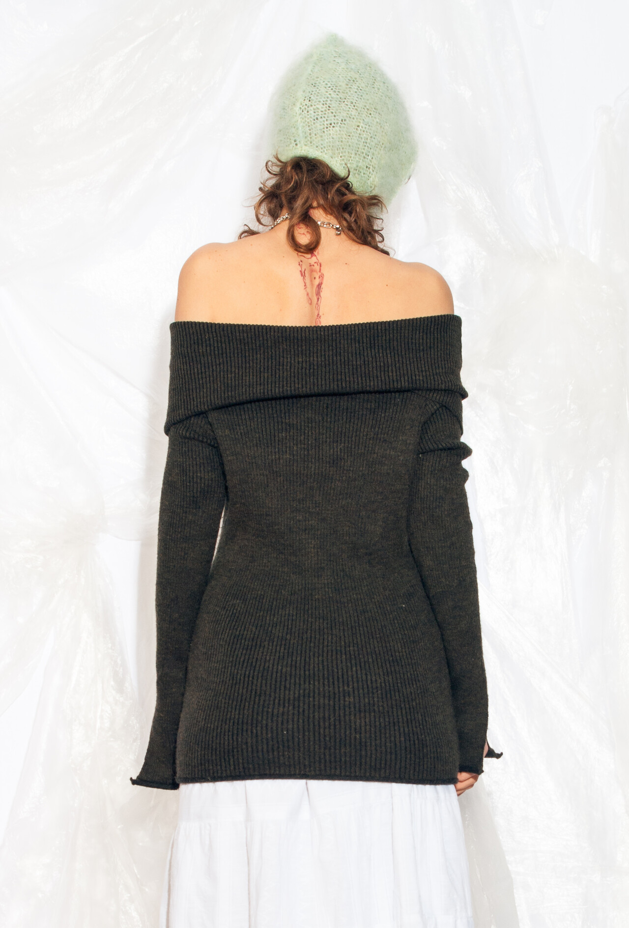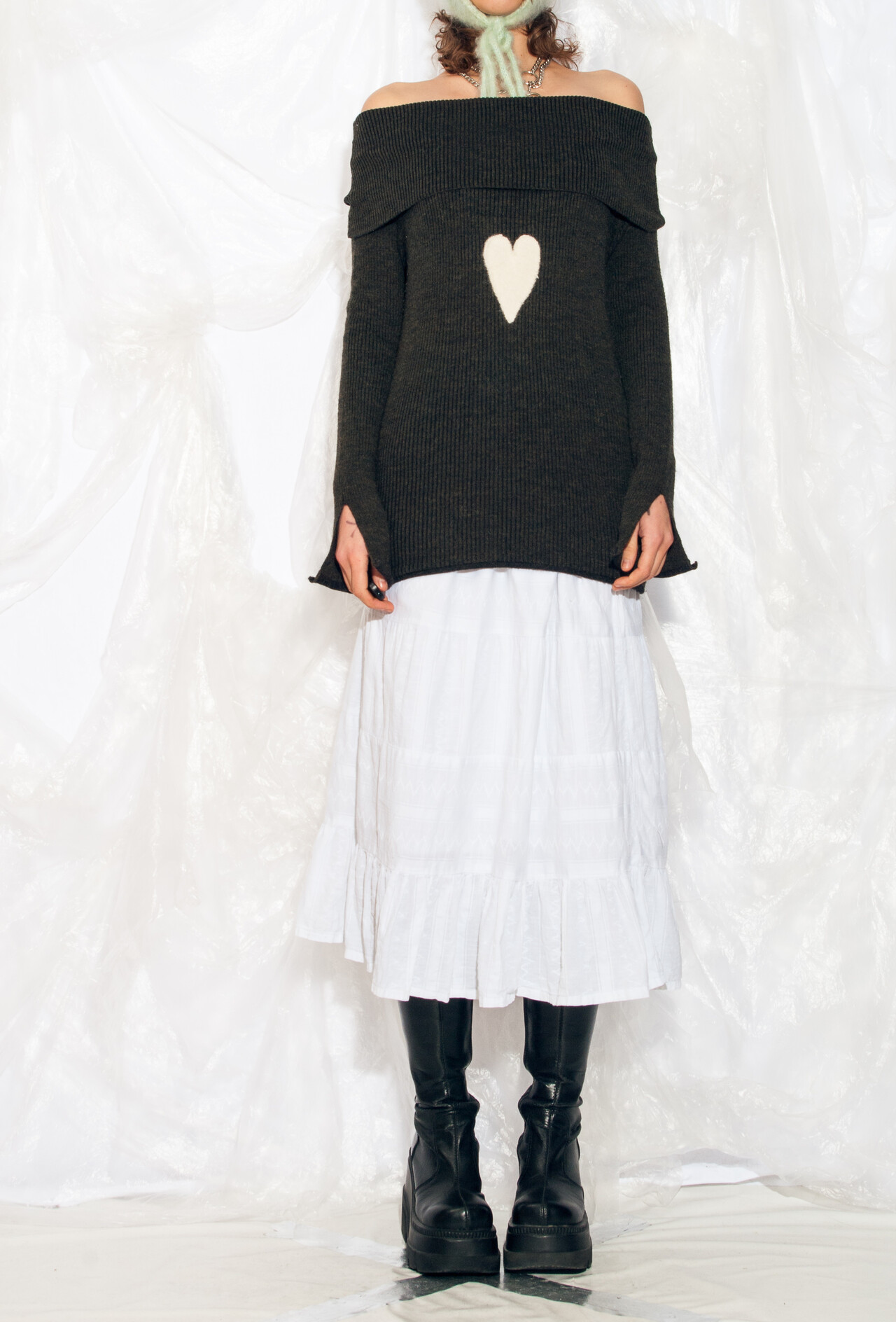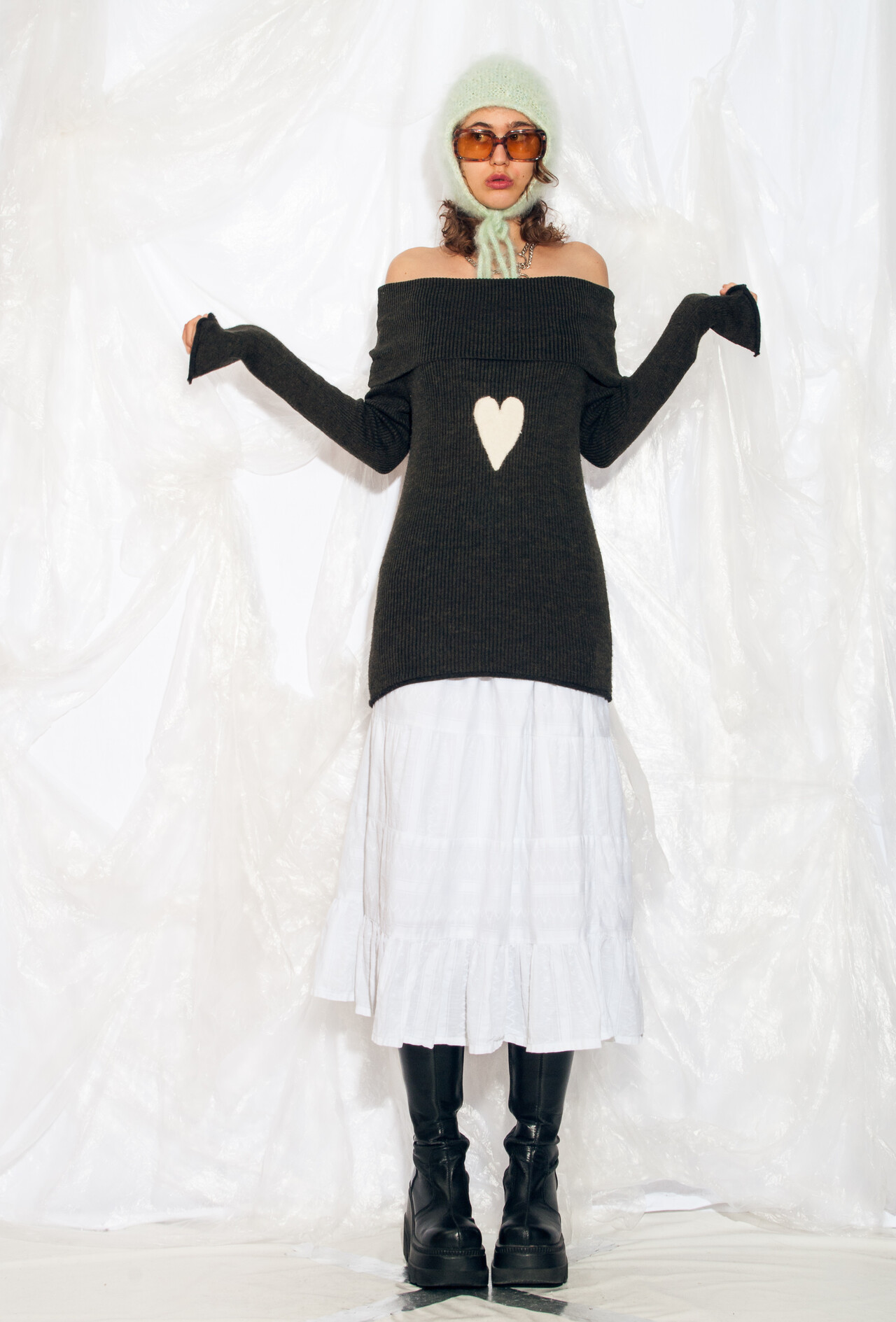 Vintage Y2K Off Shoulder Knit Jumper in Grey w Heart