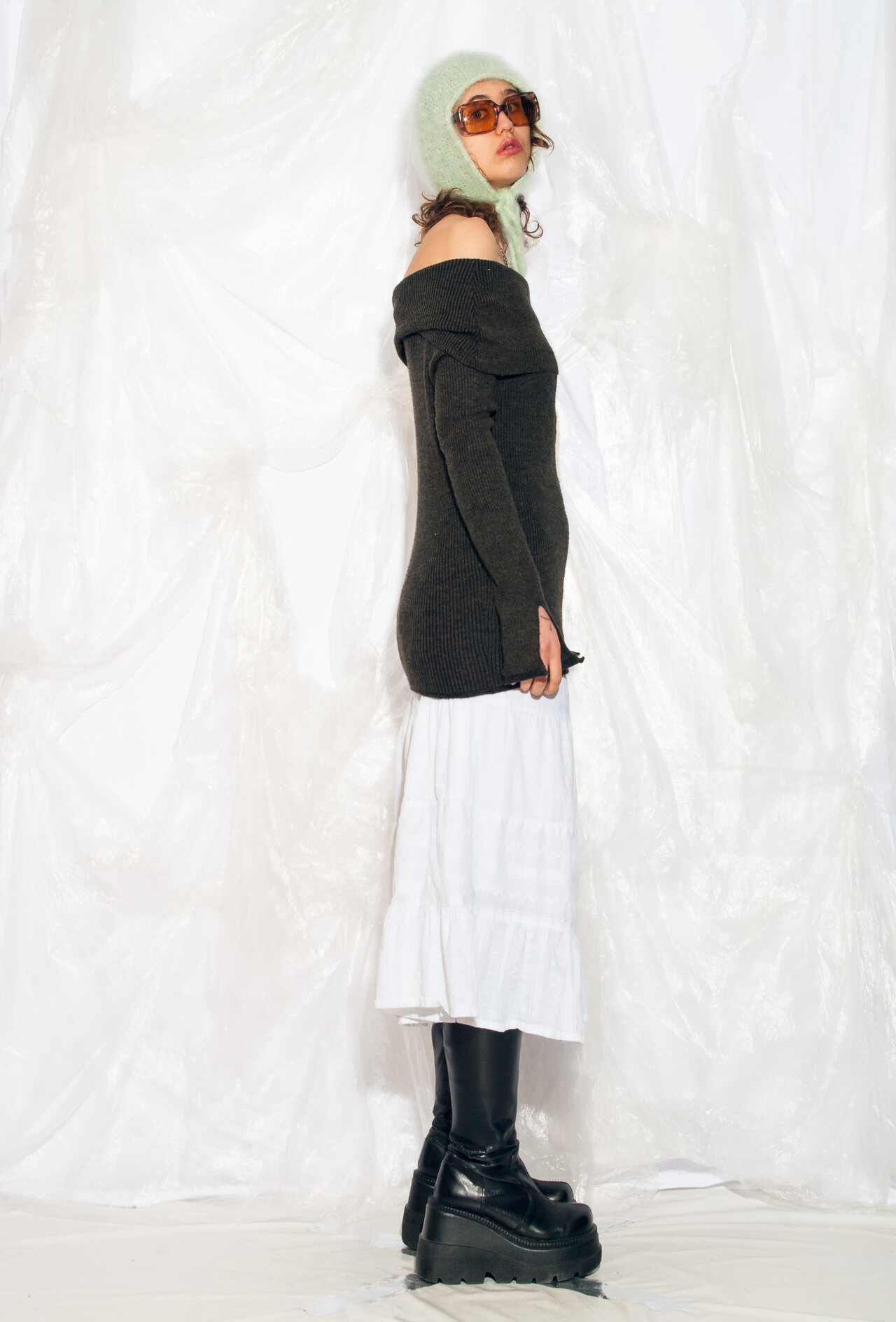 This reworked Y2K vintage knitted jumper dress with a heart patch is off-shoulder perfection. Grey and long-sleeved, it’s the ultimate in funky nostalgia vibes.